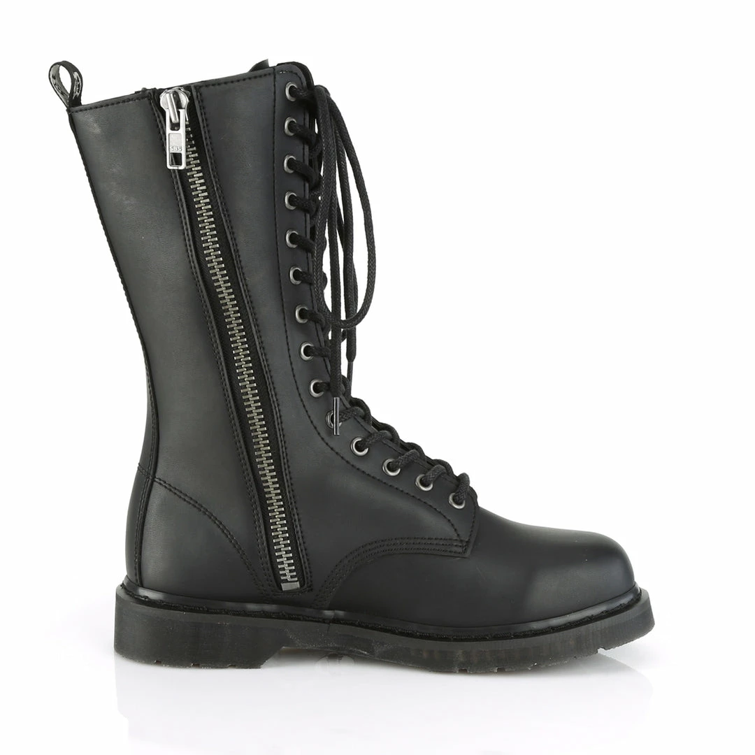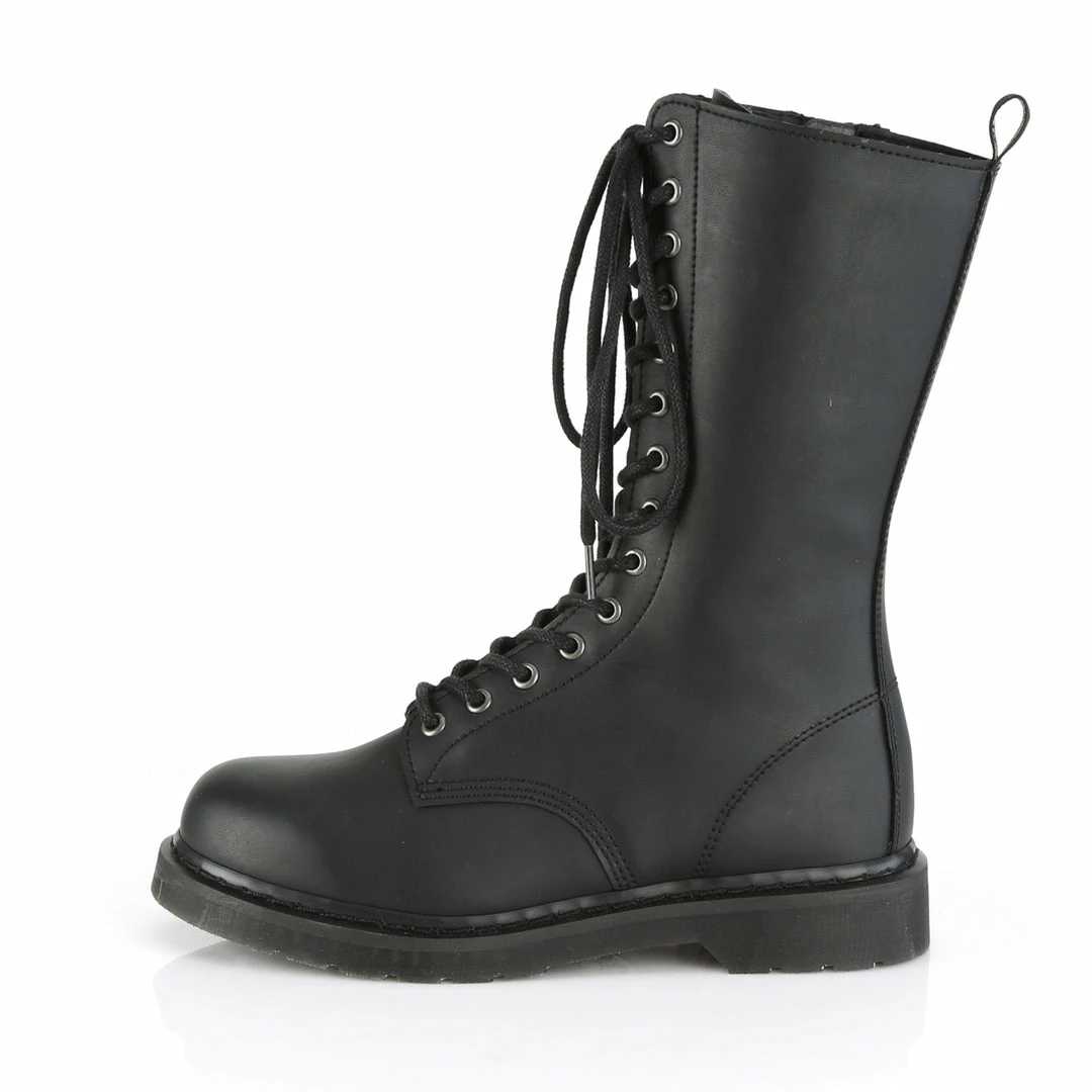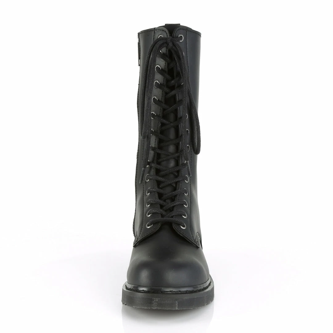 1 1/4″” (32mm) Stacked Flat Heel 14-Eyelet Lace-Up Mid Calf Unisex Vegan Boot w/ Back Pull-Tab, Inside Zip Closure