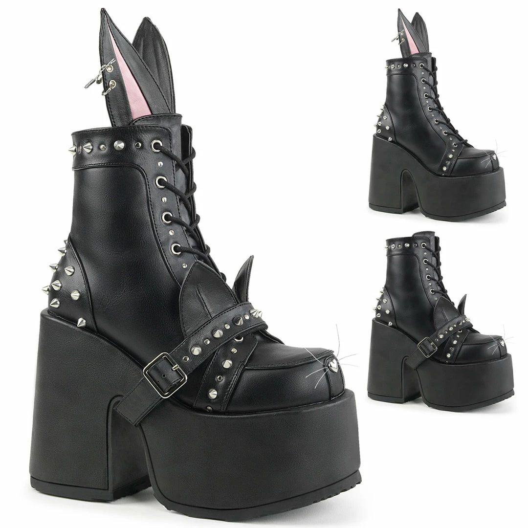5″ (12.7cm) Chunky Heel, 3″ (7.6cm) Platform Lace-Up Front Ankle Boot Featuring Interchangeable Cat/Bunny Ear Design and Spike & Stud Detail, Inside Zipper Closure