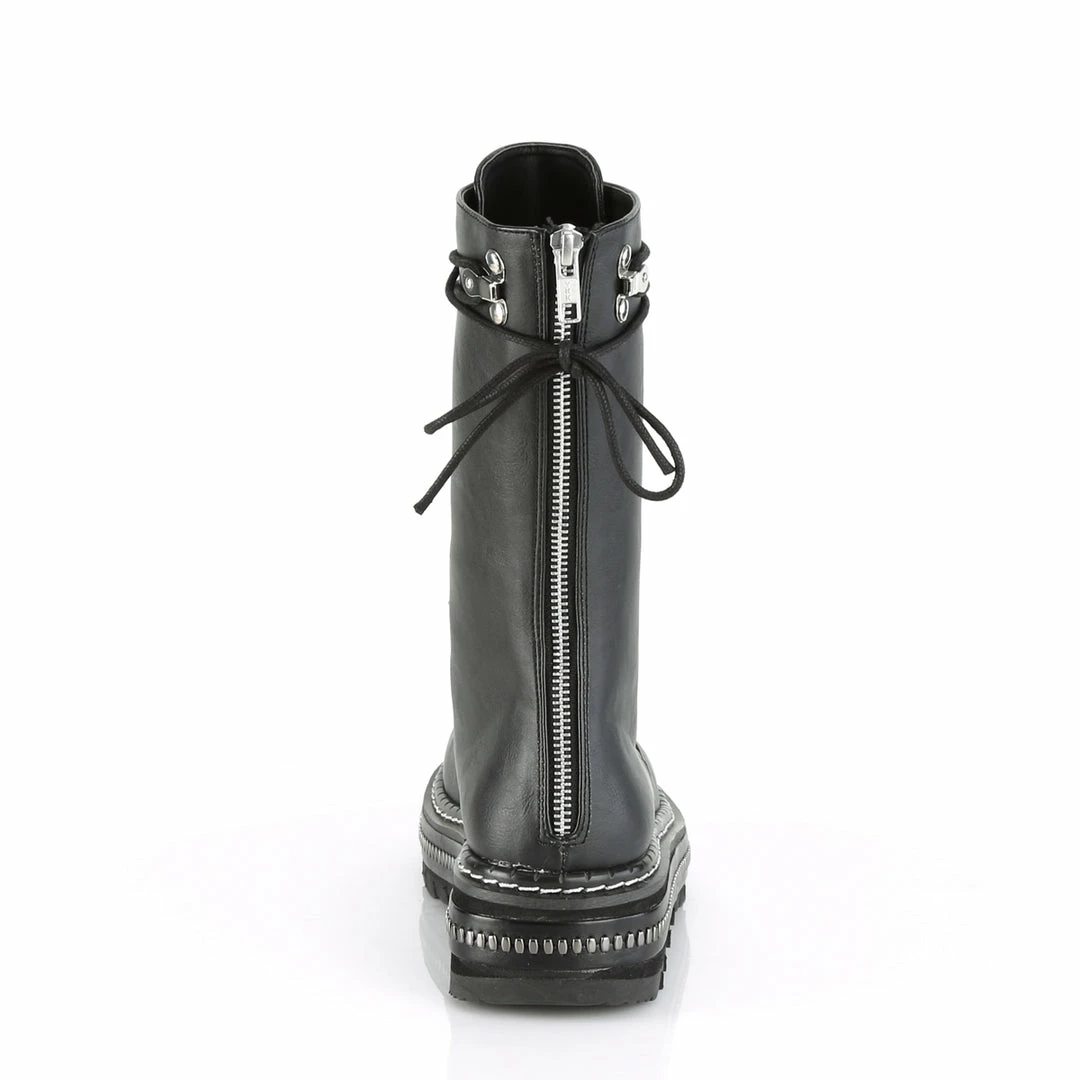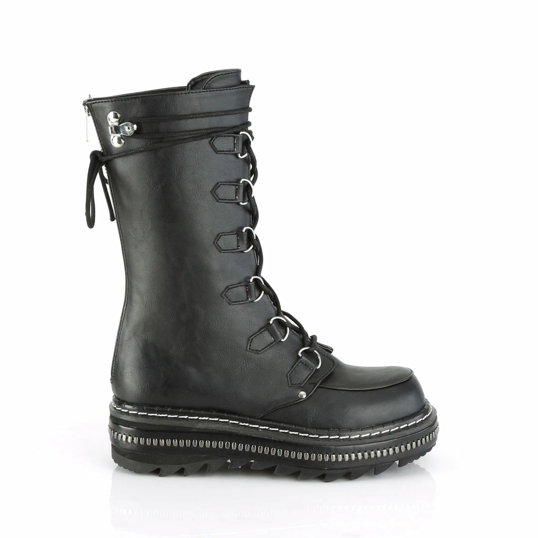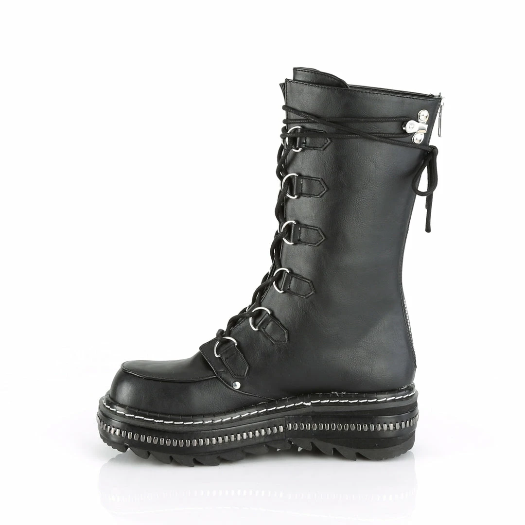 1 1/4″” (32mm) Metal Trimmed Platform D-Ring Lace-Up Mid-Calf Boot, Back Zip Closure