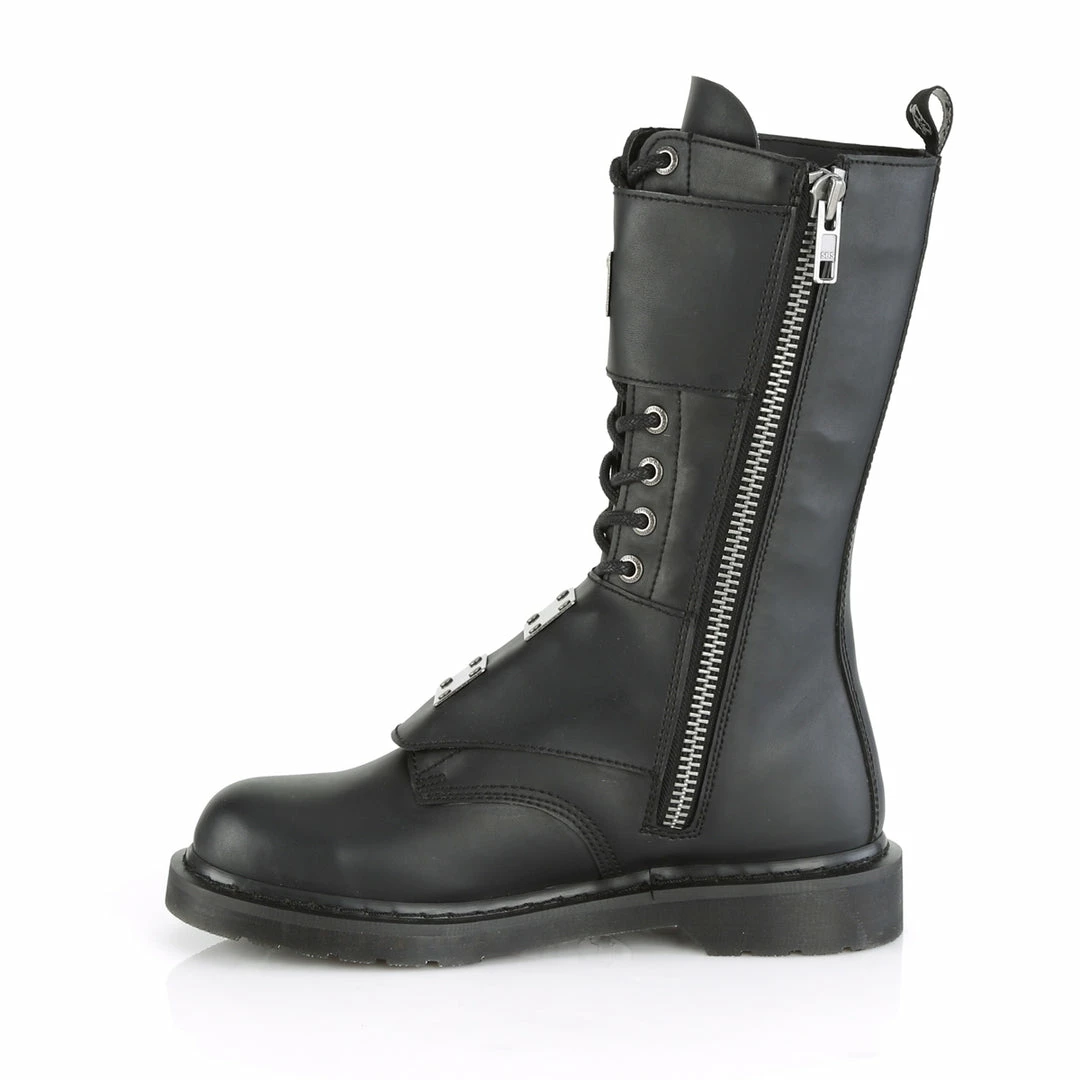 1 1/4″” (32mm) Heel 14 Eyelet Unisex Mid-Calf Combat Boot Featuring Buckled Panels w/ Metal Plate Center, Inside Zip Closure