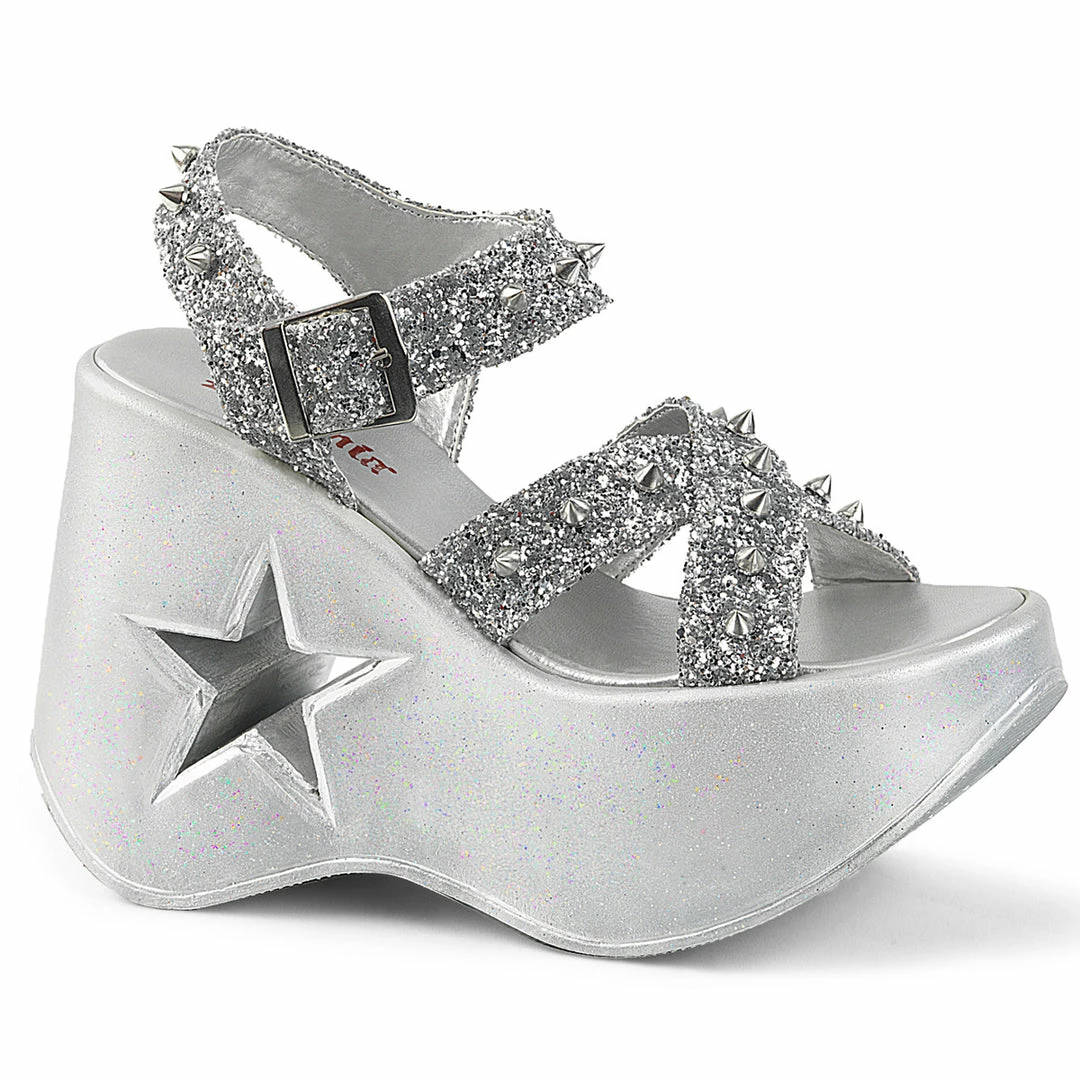 5″” (12.7cm) Star Cutout Criss Cross Ankle Strap Platform Wedge Sandal with Cone Spike Detail on Straps, Silver Glitter