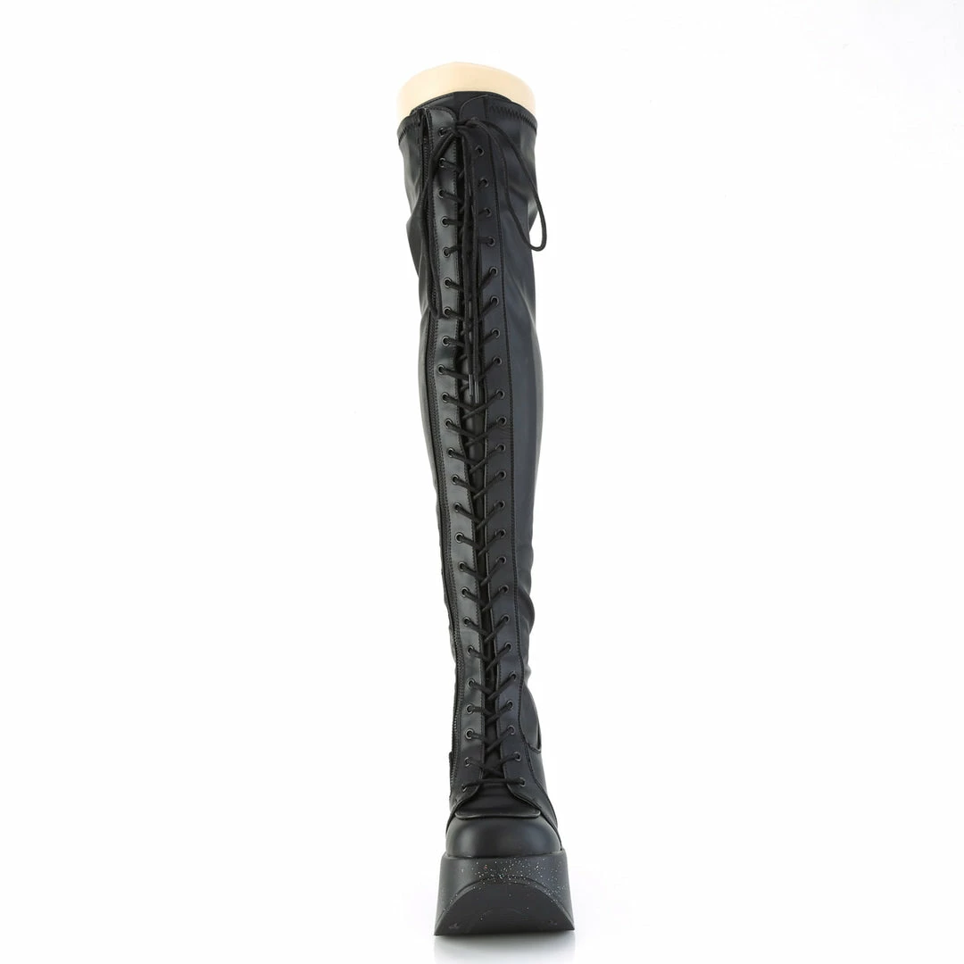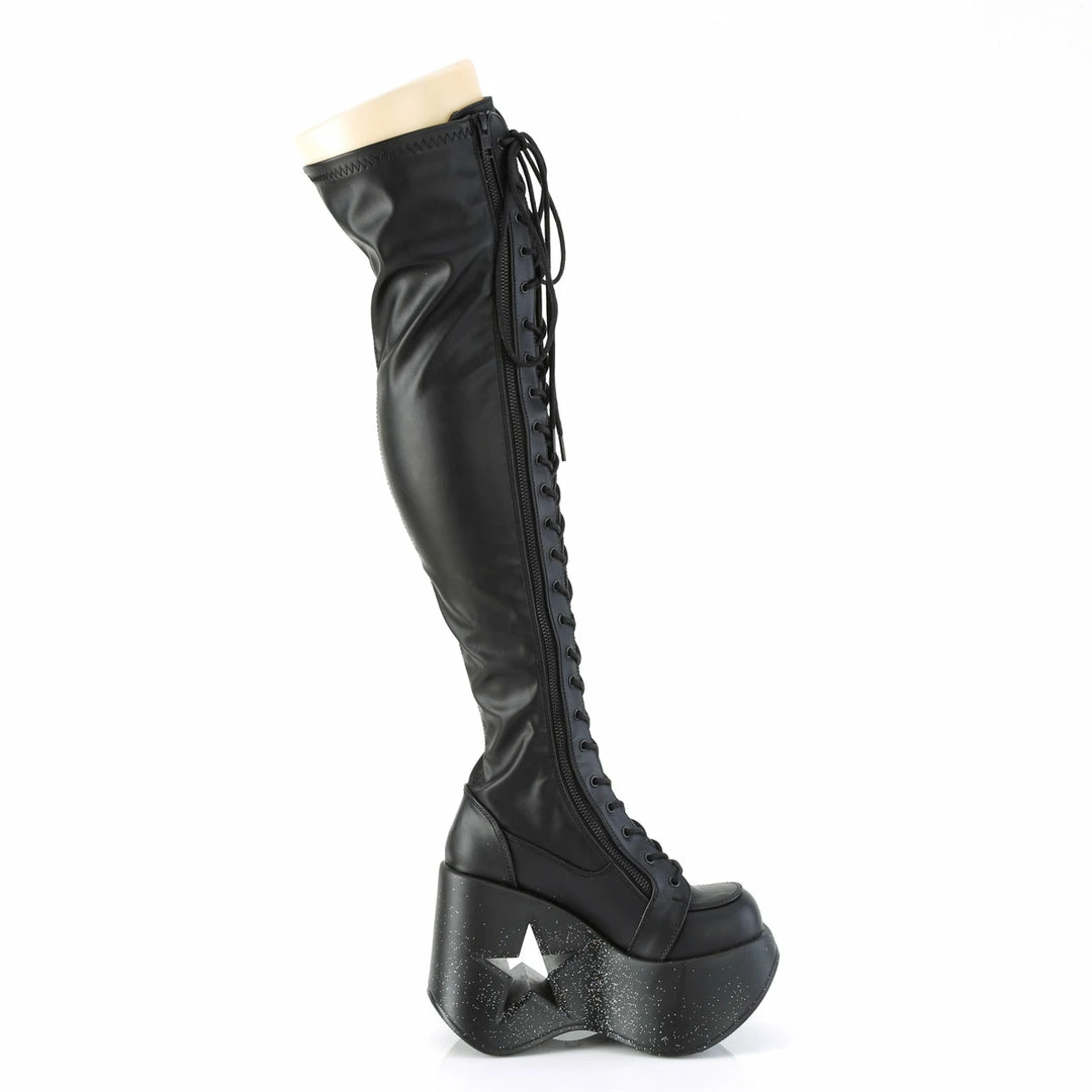 5″” (127mm) Star Cutout Platform Wedge Lace-Up Stretch Thigh-High Boot, Full Length Inner Metal Zip Closure