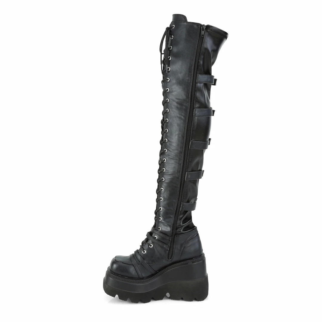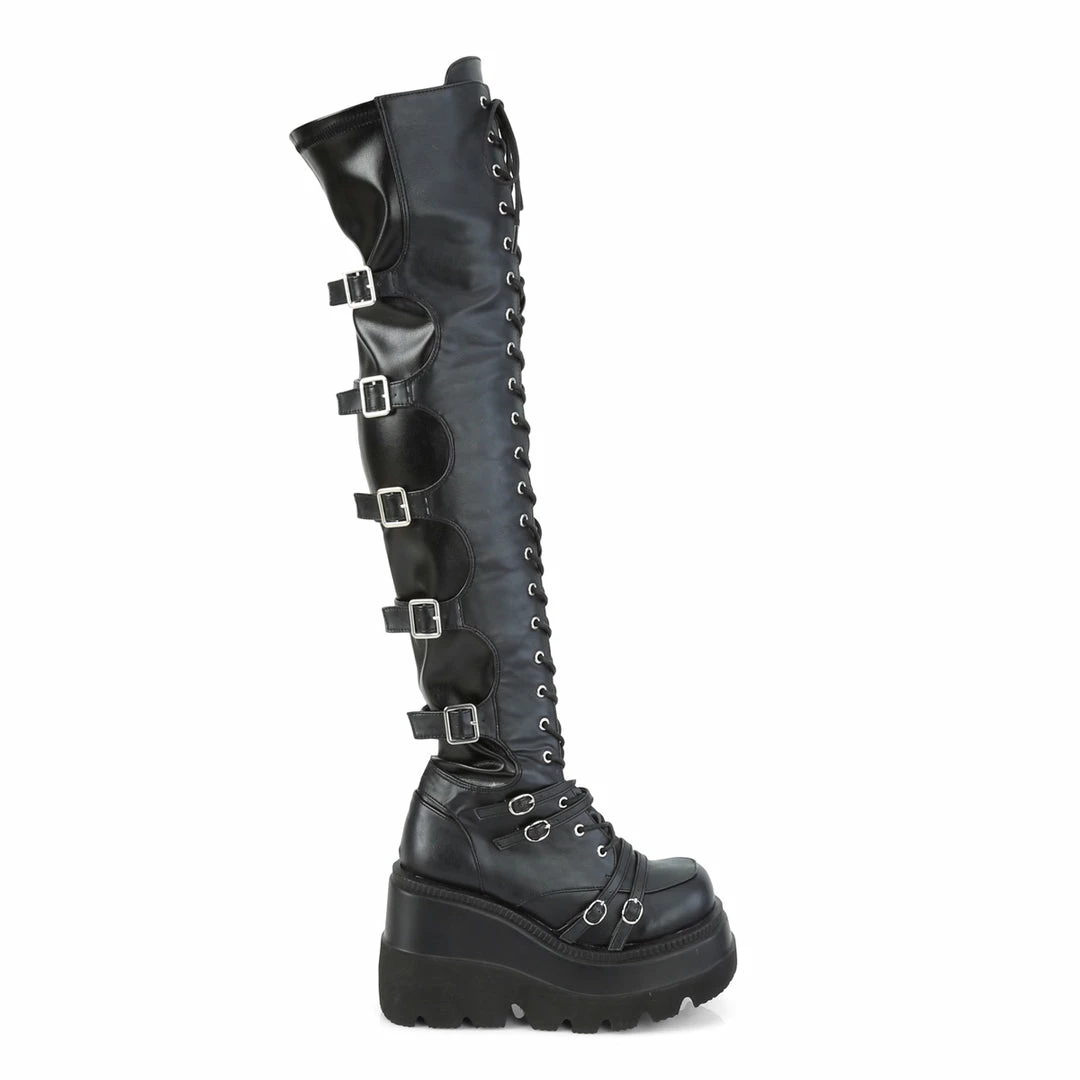 4 1/2″ (114mm) Wedge Platform Lace-Up Front Over-The Knee Boot Featuring Front Buckle Straps & Back Strech Panel w/ Lacing and Buckle Details, Side Zip Closure