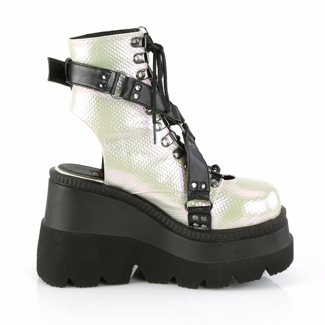 4 1/2″” (114mm) Wedge Platform Open Back Lace-up Ankle Boot Featuring Adjustable Studded Harness & Deep Grooves in the Outsole