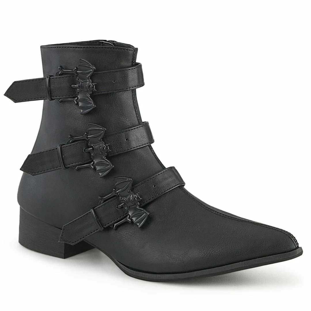 1 1/2″” (38mm) Block Heel Pointed Toe Winklepicker Style Ankle Boot, Featuring Triple Bat Buckle Straps, Inside Zip Closure
