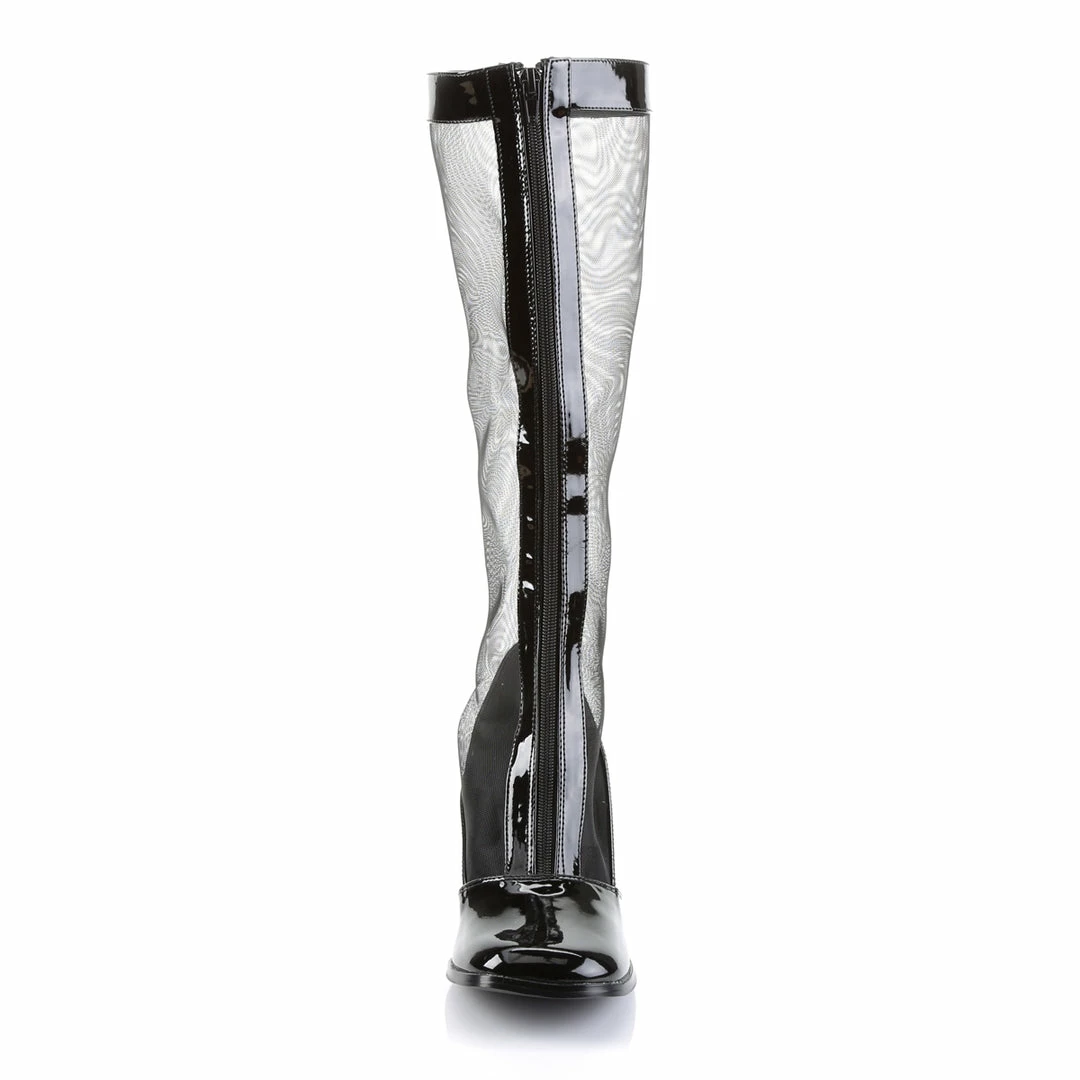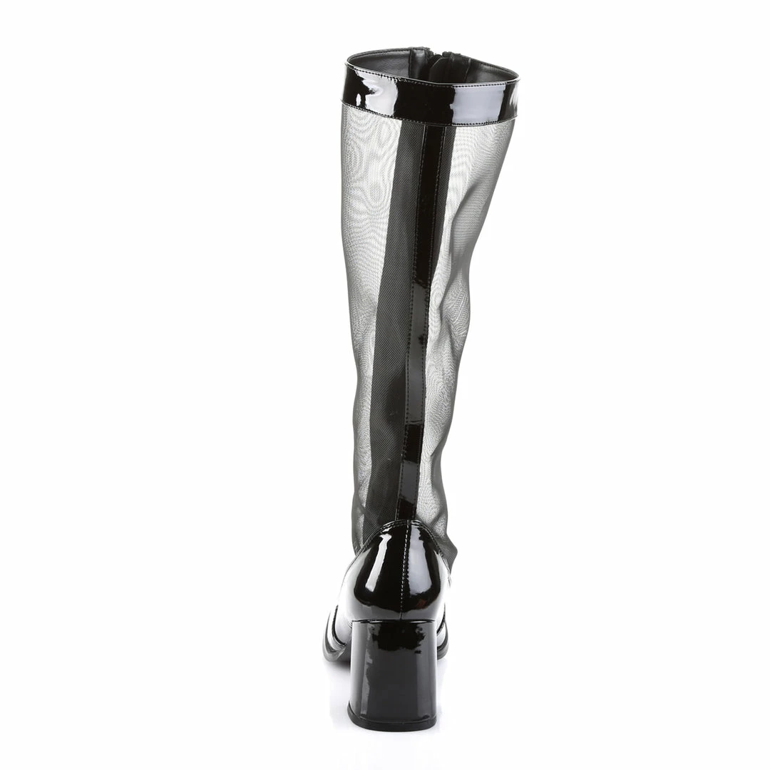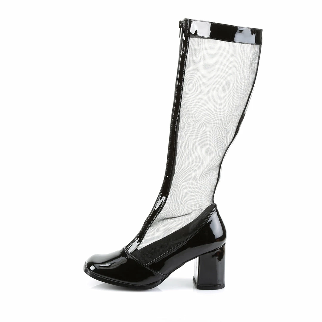 3″” (7.6cm) Block Heel Gogo Mesh Boot, Stretch Patent, Front Zip Closure