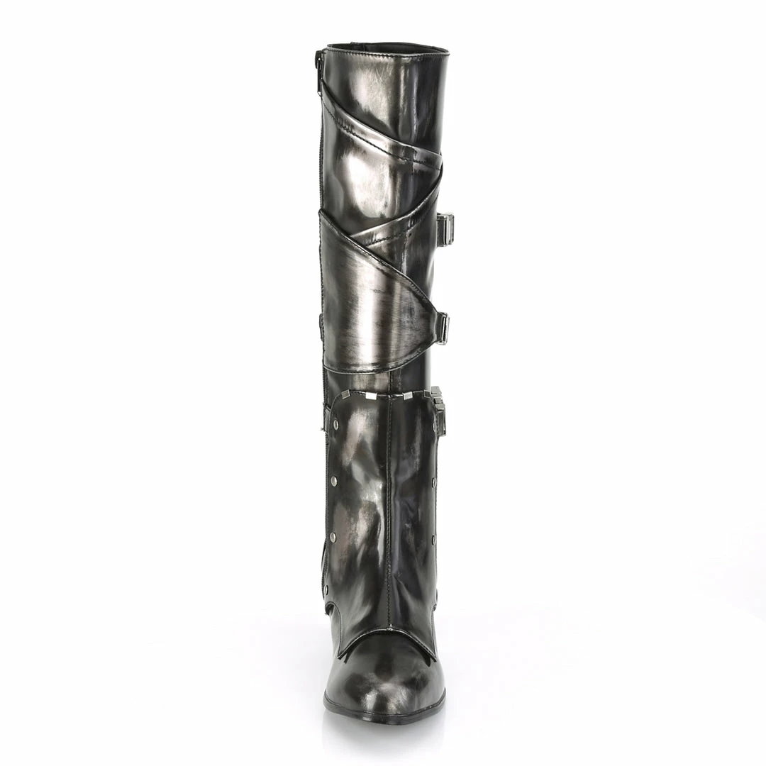 2 1/2″” (64mm) Block Heel Knee High Boot W/ Metal Buckle Straps and Studding Detail, Full Length Inside Zip Closure