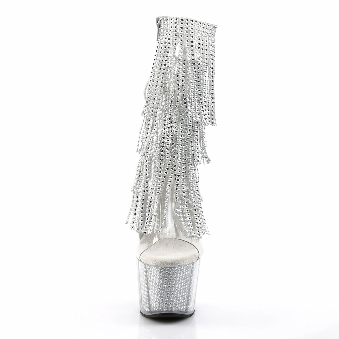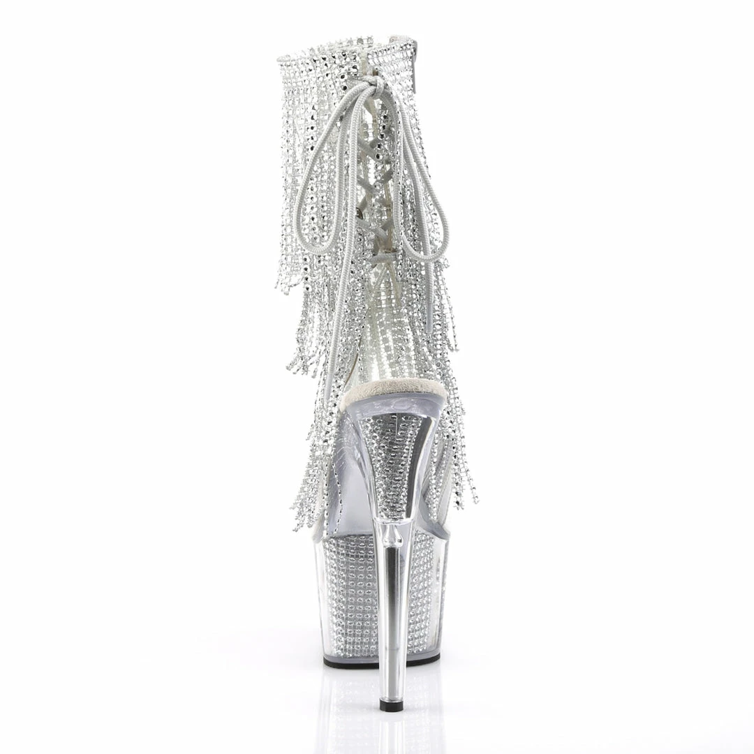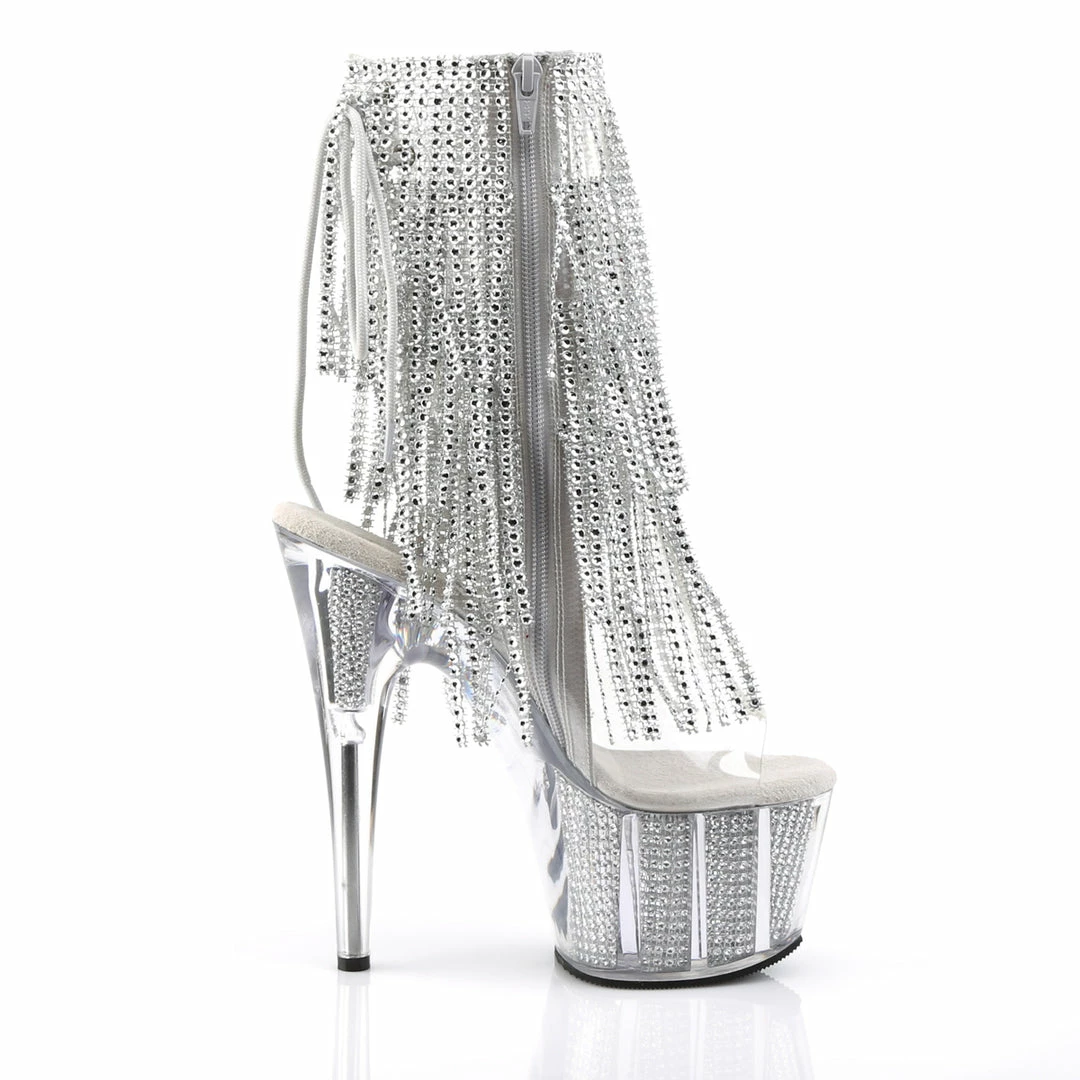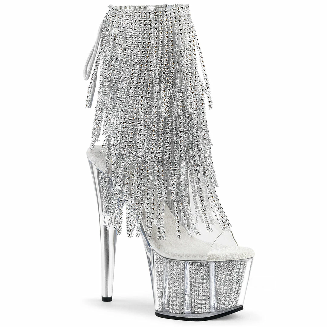 7″ (17.8cm) Stiletto Heel, 2 3/4″ (7cm) Platform Lace-Up Back Ankle Boot Featuring 4-Layer Fringe & Chrome Plated, Simulated Rhinestone Filled Platform