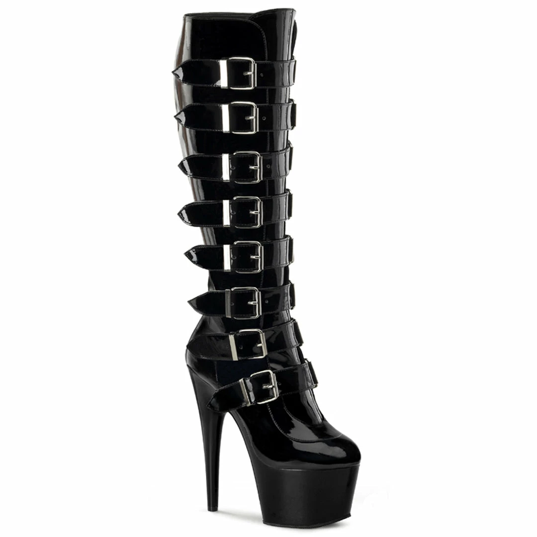 7″” (17.8cm) Stiletto Heel, 2 3/4″” (7cm) Platform Knee Boot with Buckles Full Inner Side Zipper