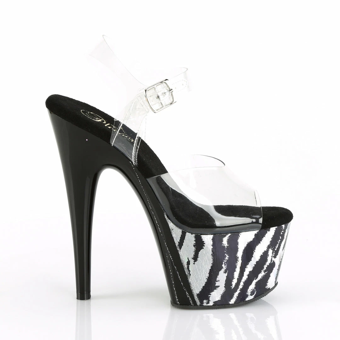 7″” (178mm) Heel, 2 3/4″” (70mm) Platform Ankle Strap Sandal w/ Holographic Zebra Print on the Platform Bottom