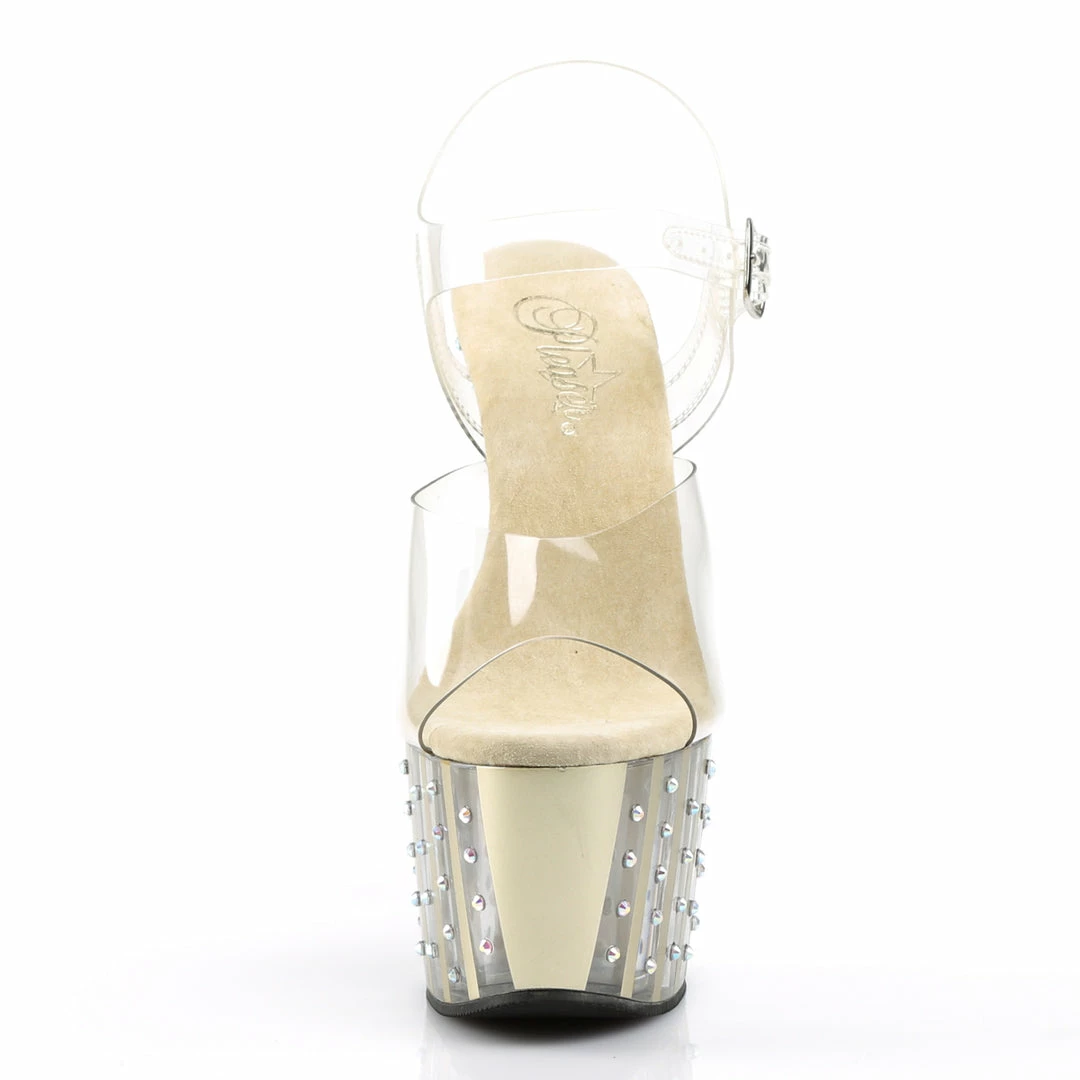 7″” (17.8cm) Stiletto Heel, 2 3/4″” (7cm) Platform Ankle Strap Sandal Featuring Rhinestone Lined Platform
