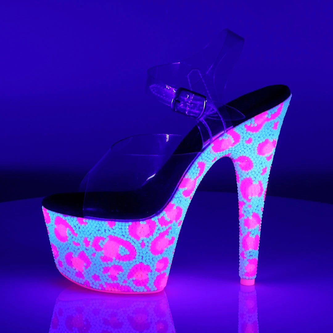 7″ (17.8cm) Heel, 2 3/4″ (7cm) Platform Ankle Strap Sandal Featuring Blacklight Sensitive Rhinestone Covering Entire Platform in Leopard Skin Pattern and Blacklight Sensitive Outsole/Toplift