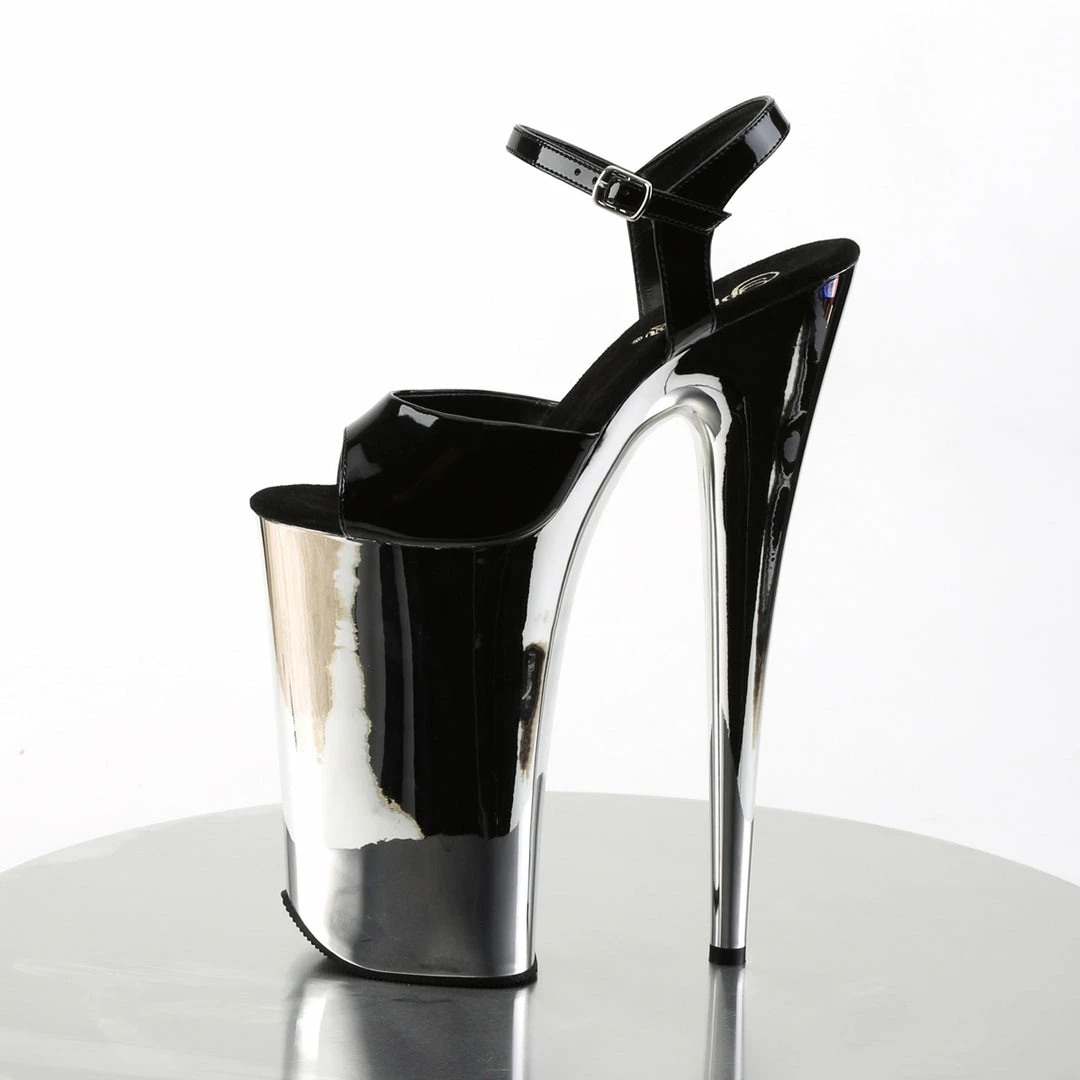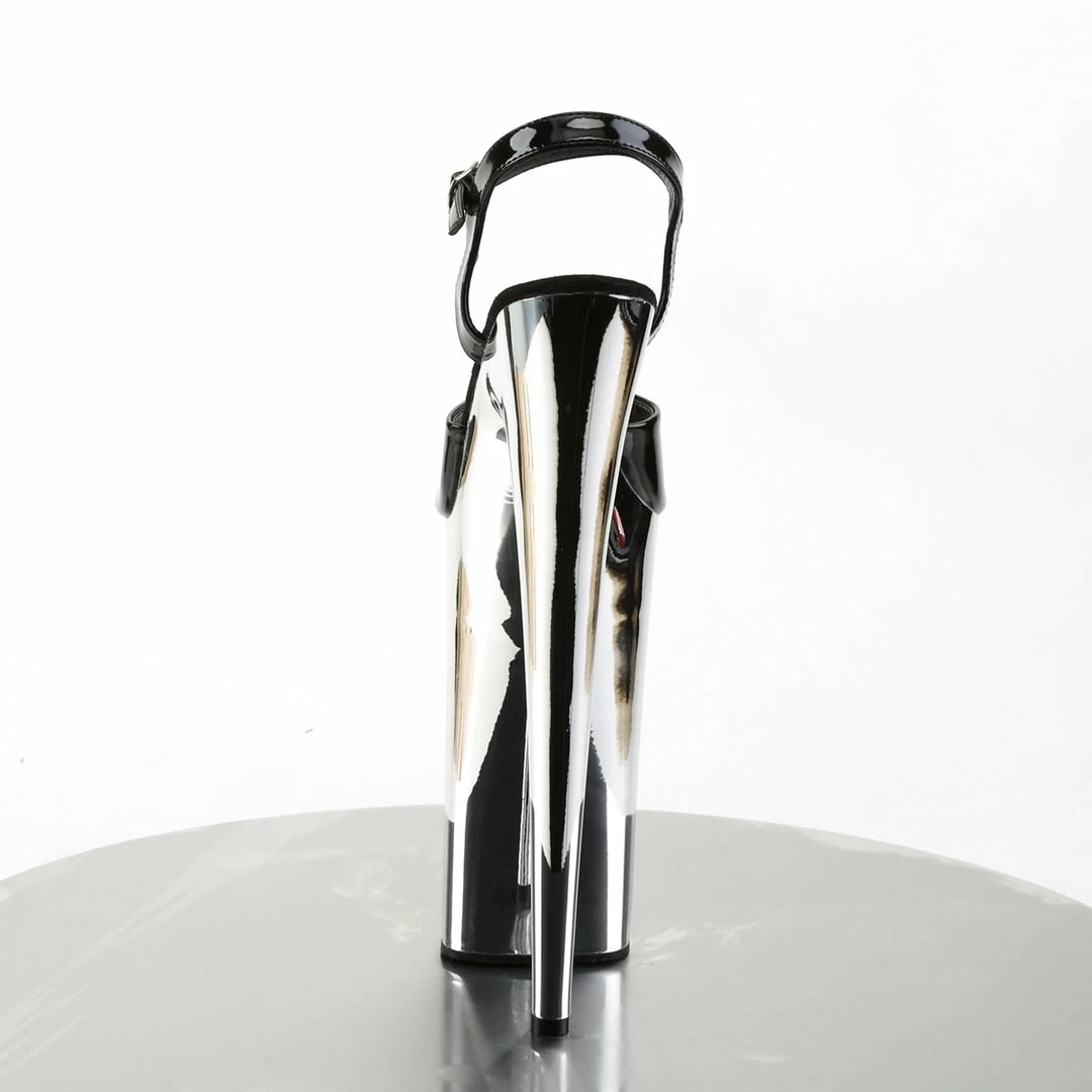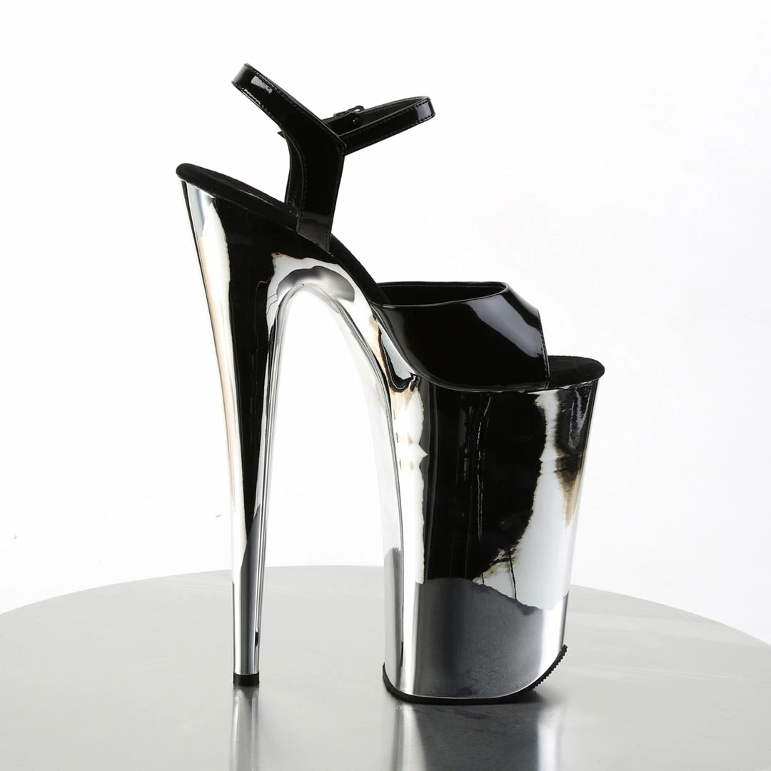 10″ (25.4cm) Heel, 6 1/4″ (15.9cm) Platform Ankle Strap Sandal Warning: Extreme High Heels. Not Recommended for Walking or Dancing. Black/Silver Chrome