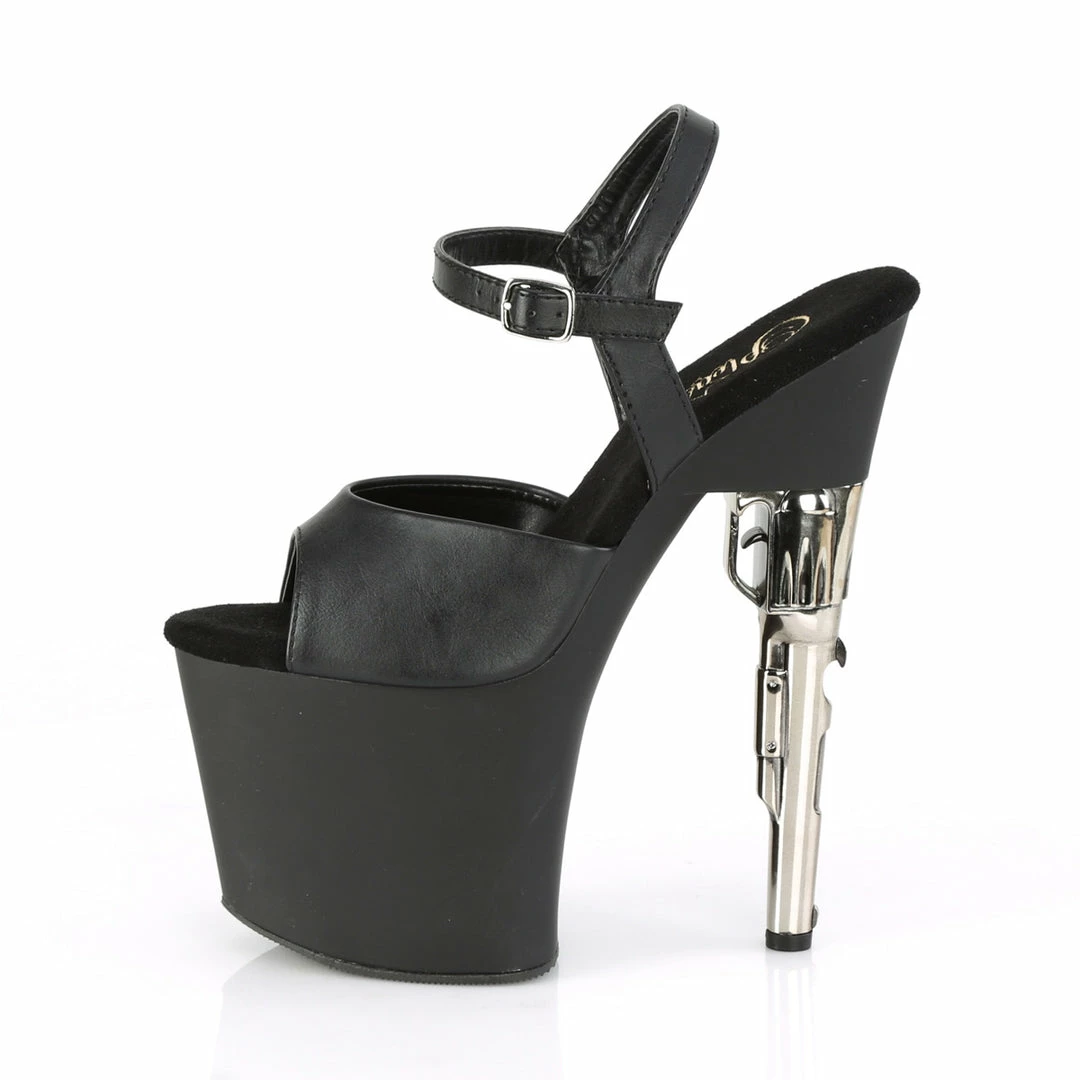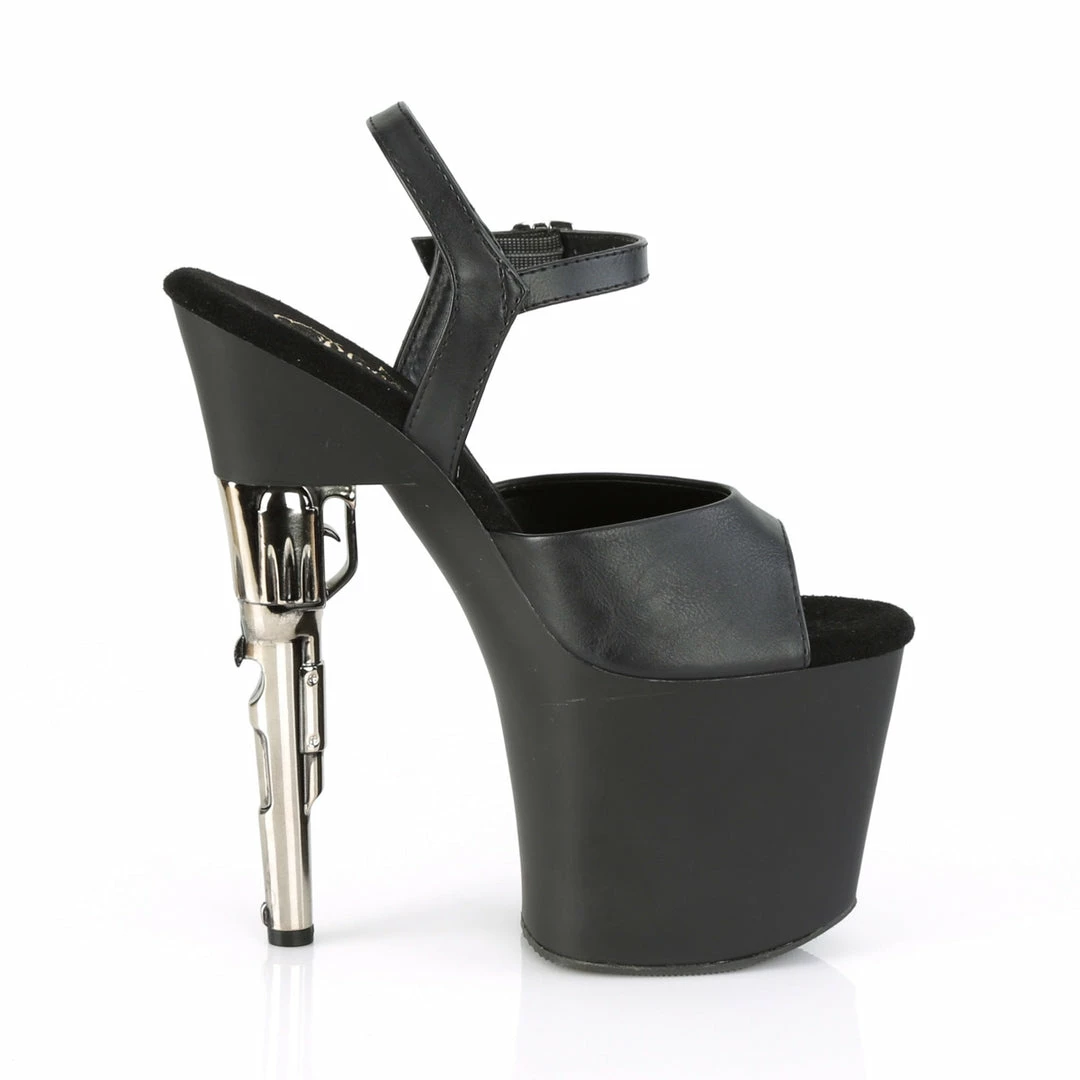 7 1/2″” (191mm) Gun Heel, 3 1/2″” (89mm) Platform Ankle Strap Sandal