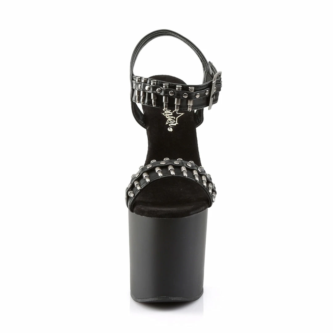 7 1/2″” (19cm) Gun Heel 3 1/2″” (8.9cm) Platform Ankle Strap Platform Sandal with Bullet Strap