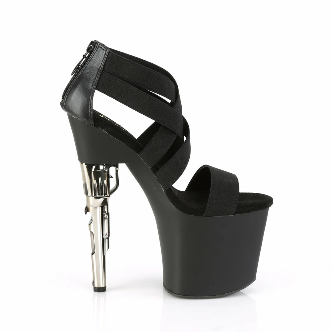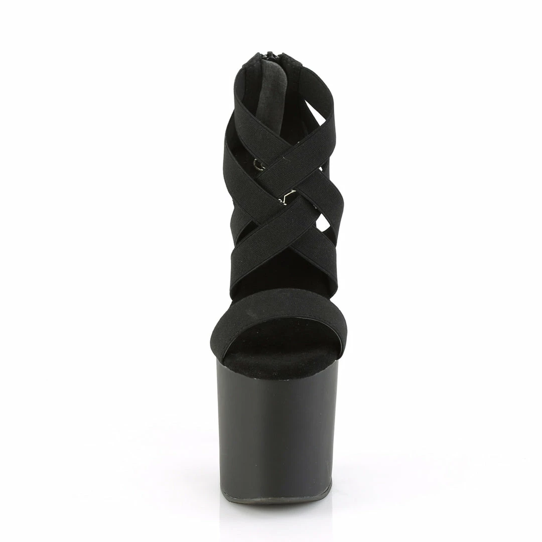 7 1/2″” (191mm) Gun Heel, 3 1/2″” (89mm) Platform Criss Cross Close Back Sandal w/ Elastic Straps, Back Zip Closure