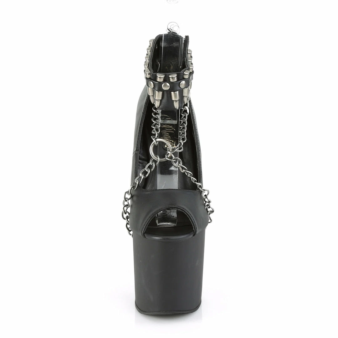 7 1/2″” (191mm) Gun Heel, 3 1/2″” Platform Peep Toe Pump Featuring Ankle Cuff w/ Bullets and Chain Detail