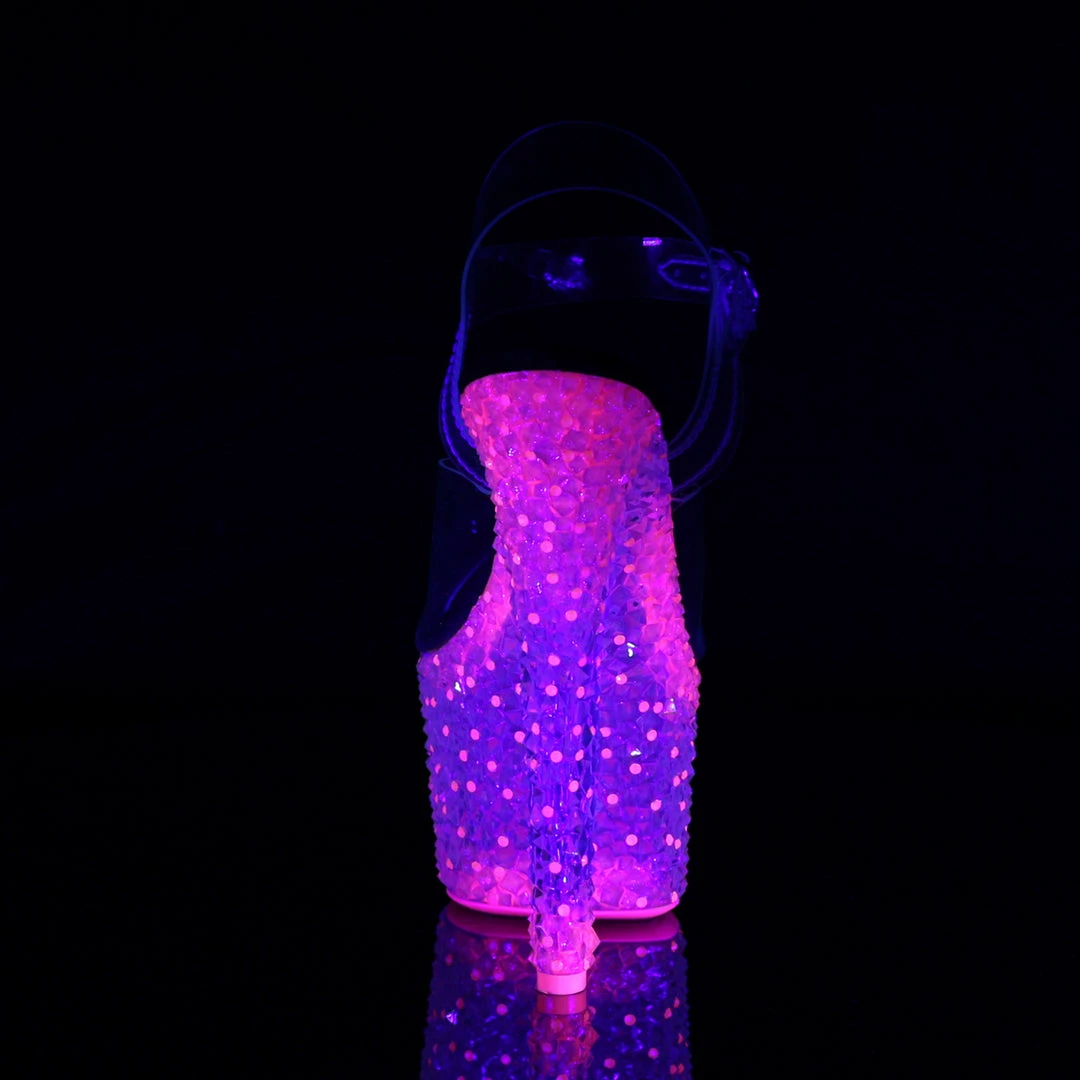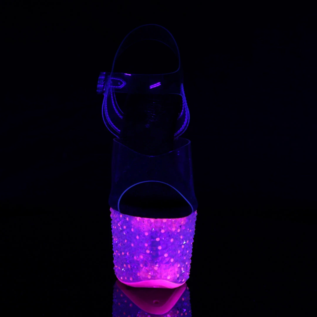 7″ (17.8cm) Stiletto Heel, 2 3/4″ (7cm) Platform Ankle Strap Sandal Featuring Entire Bottom Fully Encrusted with Neon UV Reactive Stones and Neon UV Reactive Outsole/Toplift