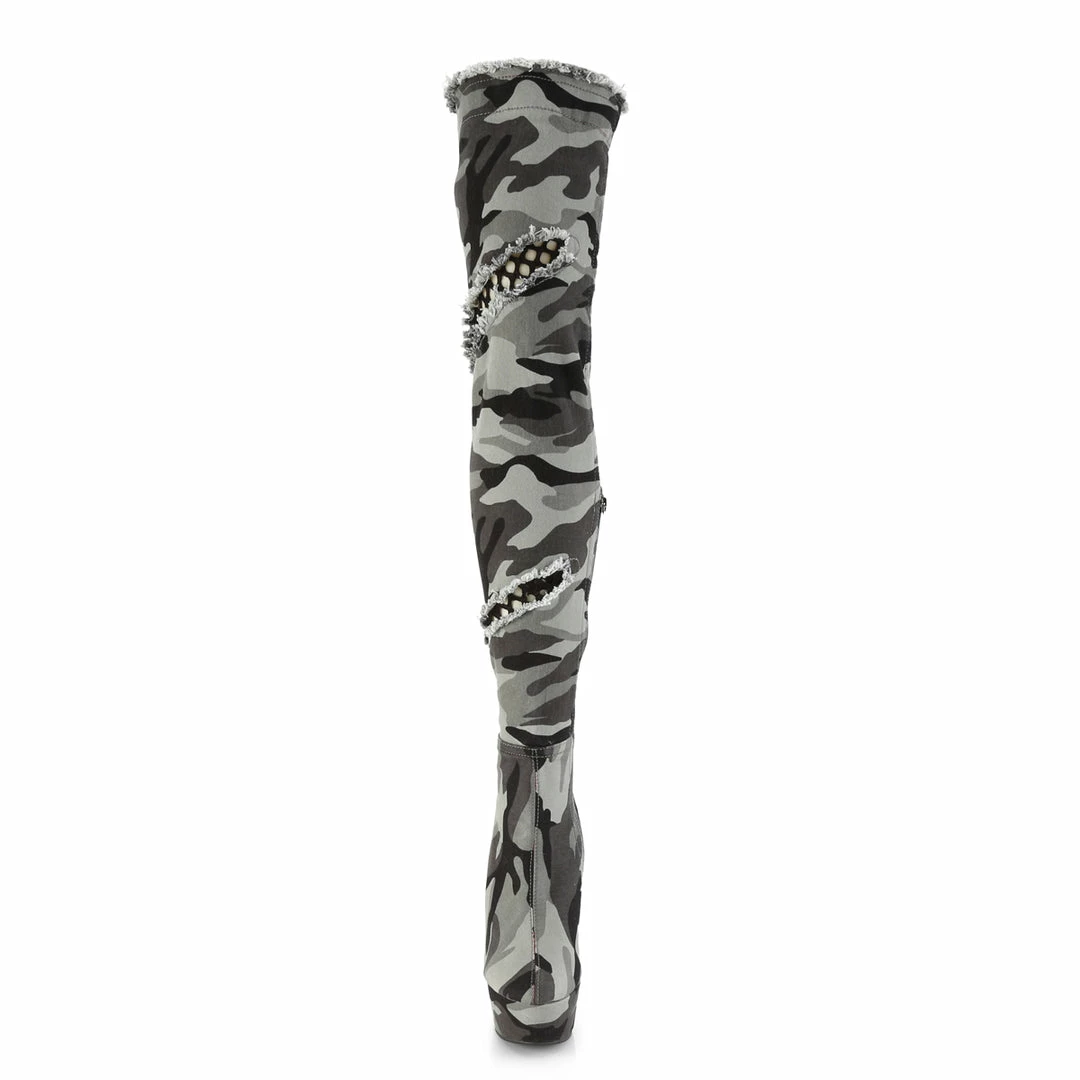 6″” (152mm) Heel, 1 3/4″” (45mm) Platform Thigh High Boot w/ Distressed Fishnet Patches, 1/2 Inside Zip Closure