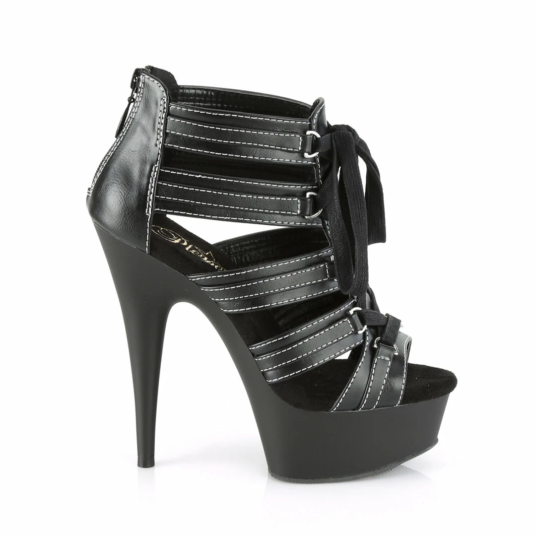 6″” (152mm) Heel, 1 3/4″” (45mm) Platform Close Back Cage Sandal w/ Ornamental Front Lacing, Back Zip Closure