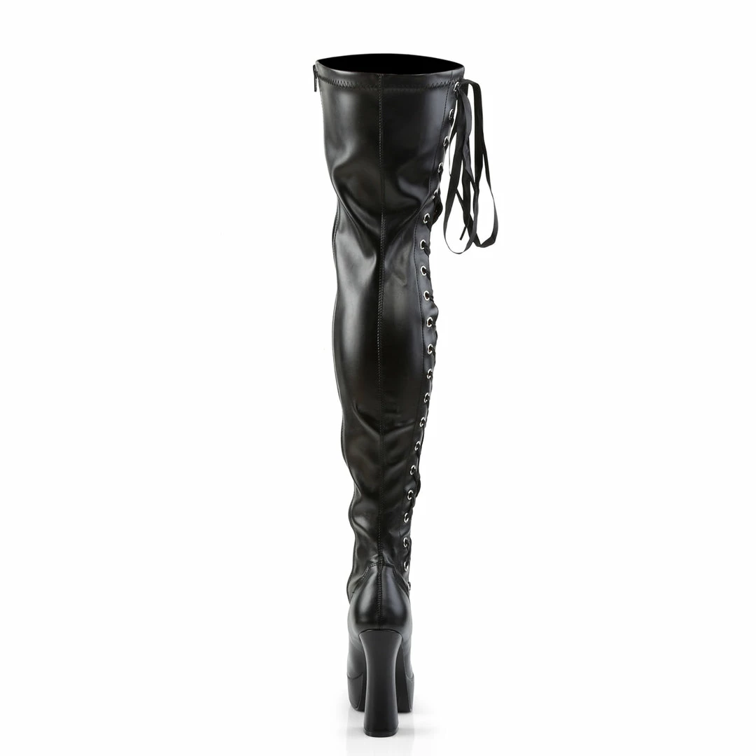 5″ (12.7cm) Stiletto Heel, 1 1/2″ (3.8cm) Platform Stretch Thigh High Boot with Lace-Up Sides, Interchangeable Black and Red Ribbon Laces, Full-Length Inside Zip Closure