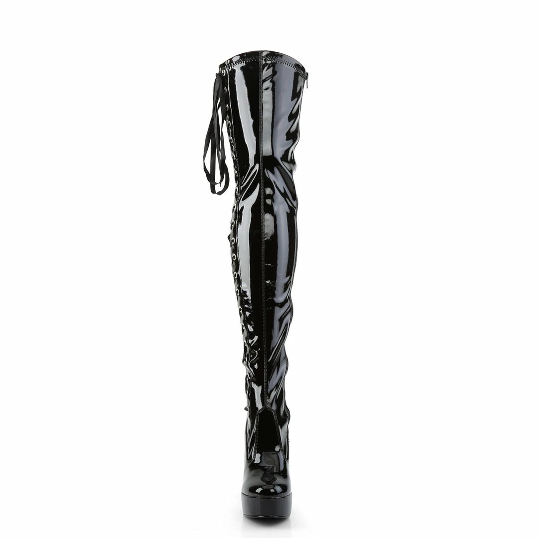 5″ (12.7cm) Stiletto Heel, 1 1/2″ (3.8cm) Platform Stretch Thigh High Boot with Lace-Up Sides, Interchangeable Black and Red Ribbon Laces, Full-Length Inside Zip Closure