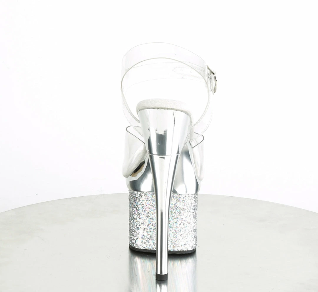 7″ (178mm) Heel, 3″ (76mm) Platform Ankle Strap Sandal w/Chrome Plated Upper Platform and Heel Featuring Holographic Glitters Covering the Platform