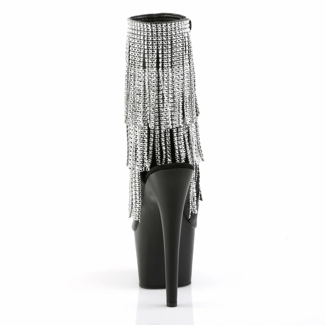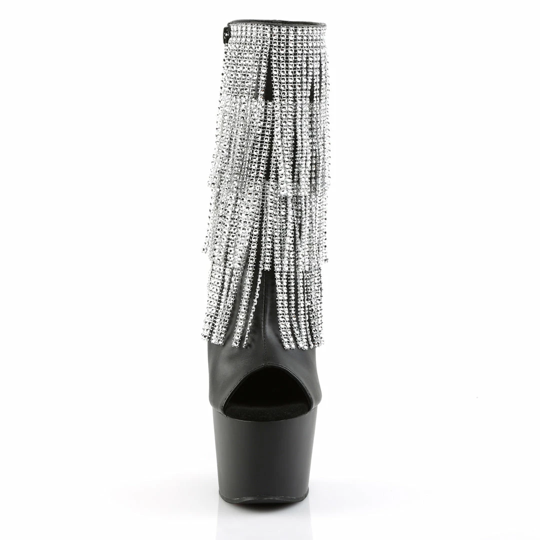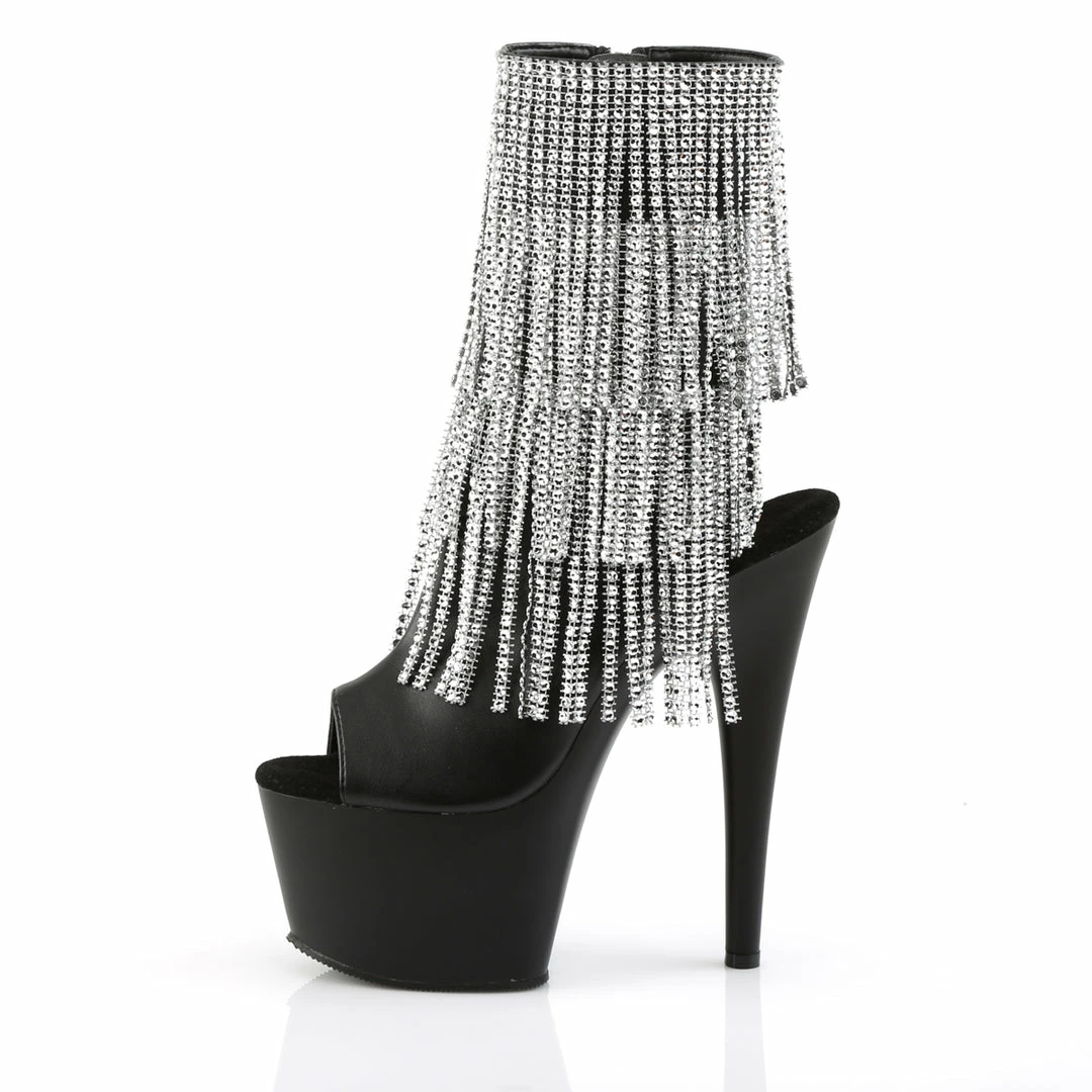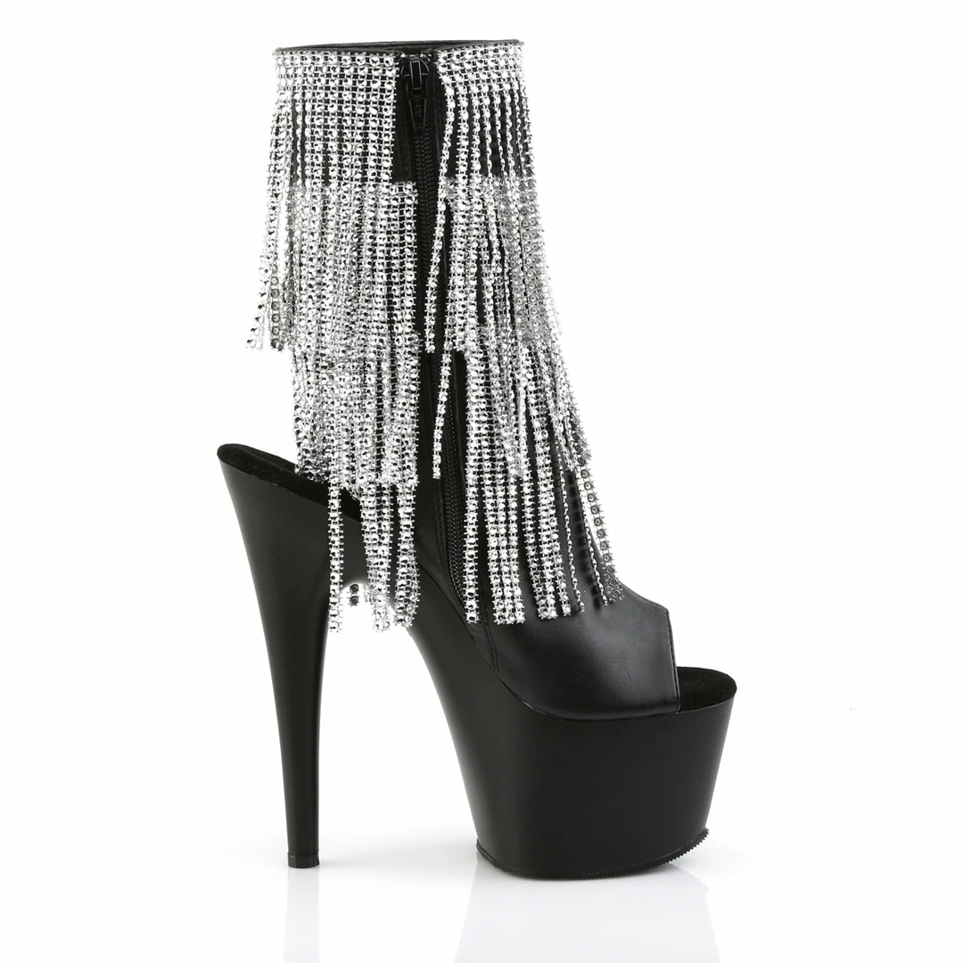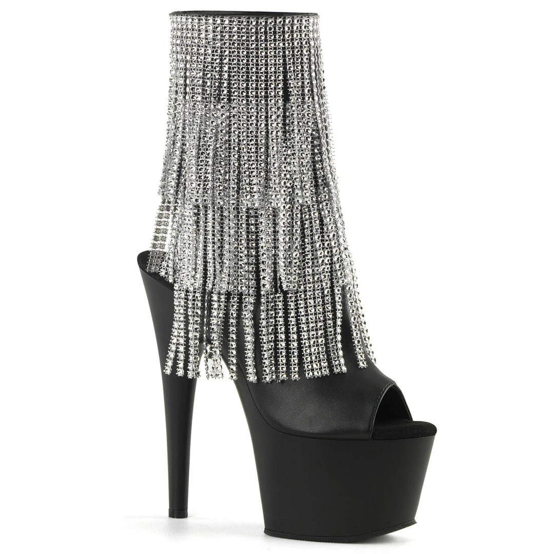 7″ (17.8cm) Stiletto Heel, 2 3/4″ (7cm) Platform Open Toe/Stiletto Heel Fringe Ankle Boot Featuring 3-Layer Chrome Plated, Simulated Rhinestone Fringe, Inside Zip Closure