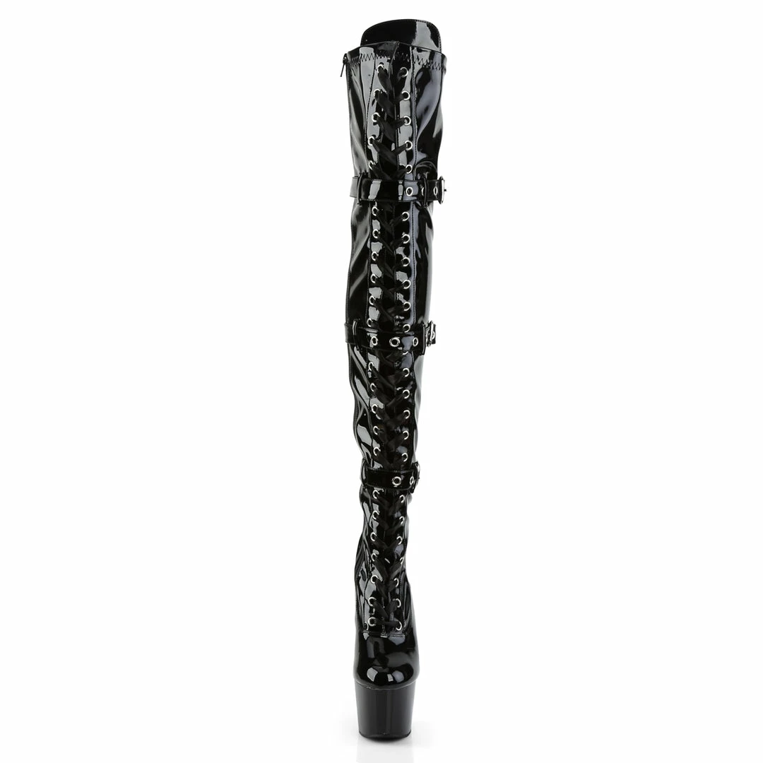 7″ (17.8cm) Stiletto Heel, 2 3/4″ (7cm) Platform Front Ribbon Lace-Up Triple Buckle Strap Stretch Thigh High Boot, Full Inside Zip Closure