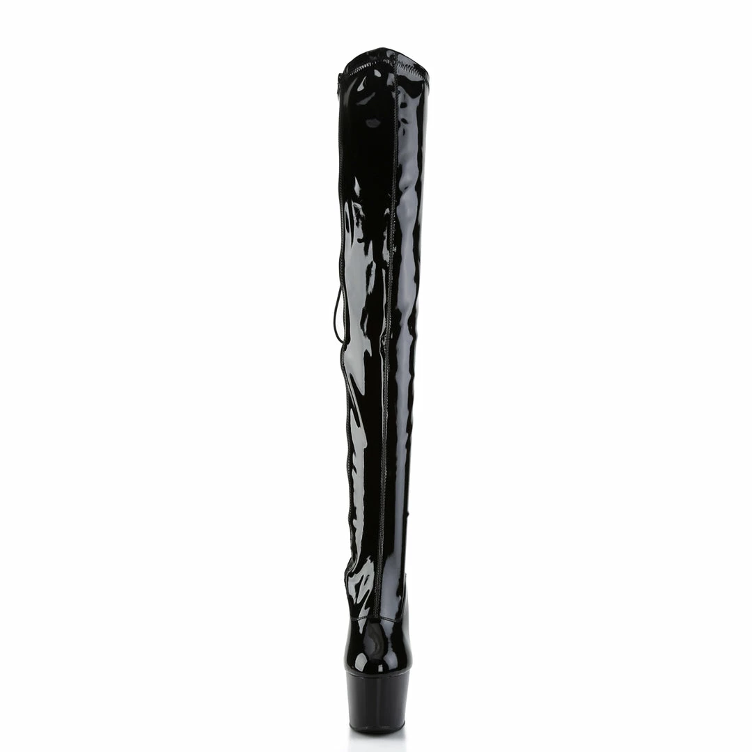7″” (17.8cm) Stiletto Heel, 2 3/4″” (7cm) Platform Rear Lace-Up Stretch Thigh Boot Full Inner Side Zipper