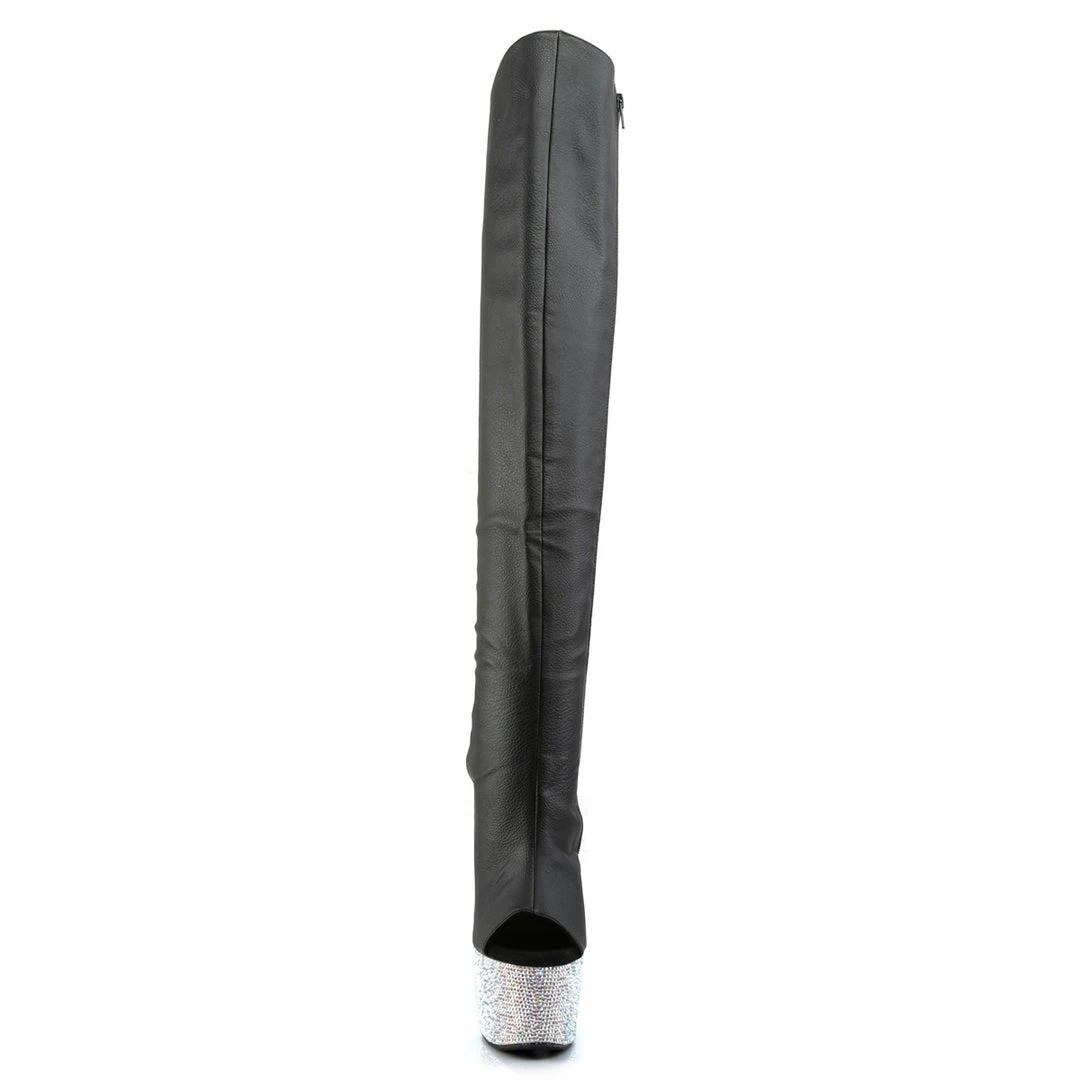 7″ (17.8cm) Heel, 2 3/4″ (7cm) Platform Open Toe/Heel Lace-Up Back Thigh High Boot Featuring Silver Multi Rhinestones Covering Entire Platform, Inside Zip Closure
