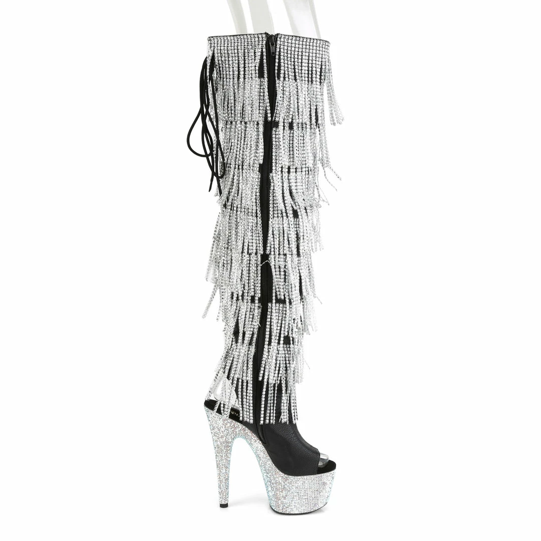 7″ (17.8cm) Heel, 2 3/4″ (7cm) Platform Open Toe/Heel Back Lace-Up Thigh High Boot Featuring 8-Layer Chrome Plated, Simulated Rhinestone Fringe and Rhinestones Encrusted Entire Platform, Inside Zip Closure