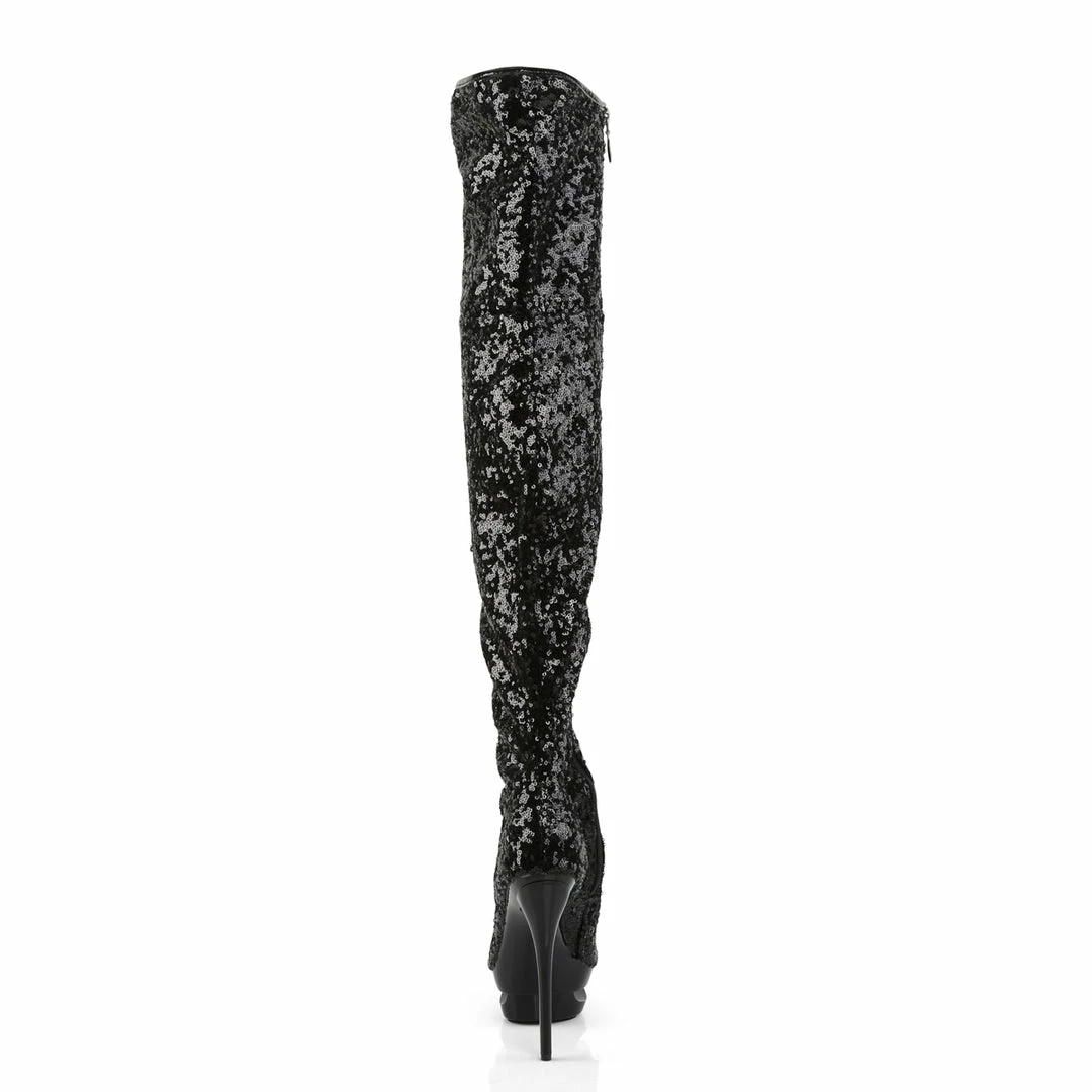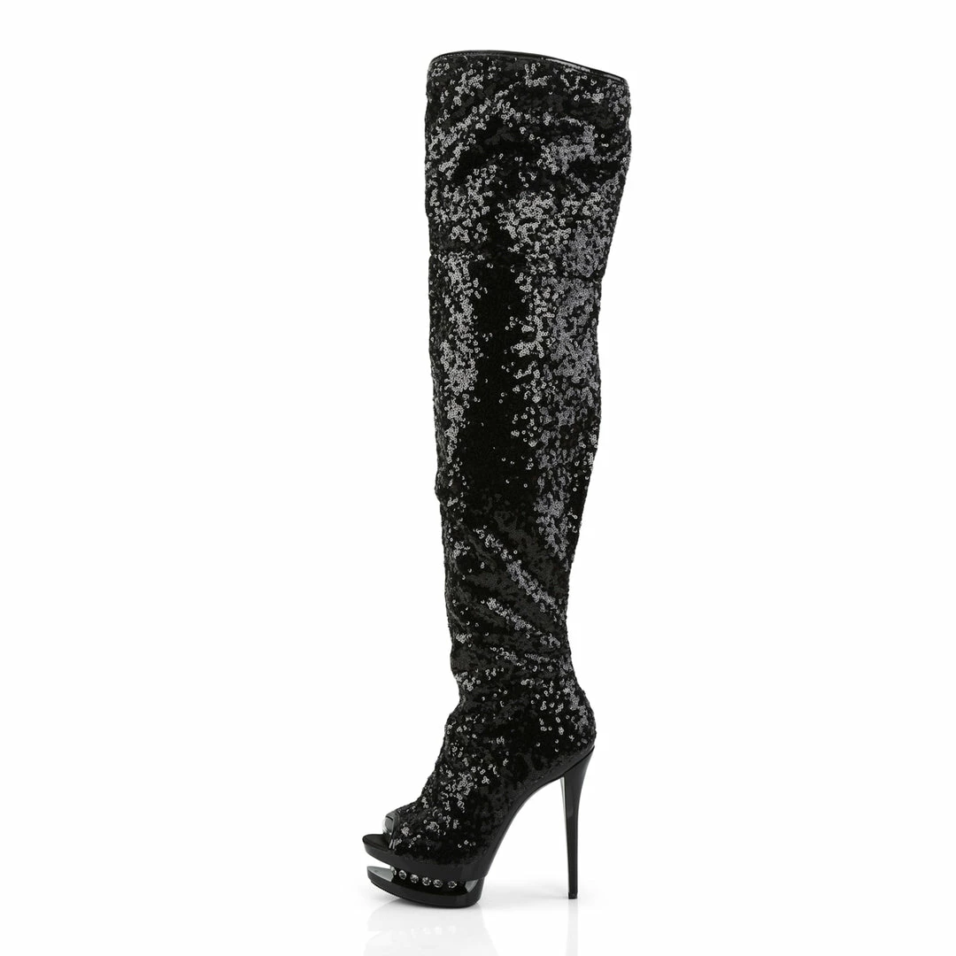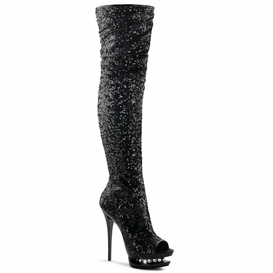 6″ (15.2cm) Stiletto Heel, 1 1/2″ (3.8cm) Platform Open Toe Thigh Boot with Rhinestone Embellishment on Inlay Full Inner Side Zipper