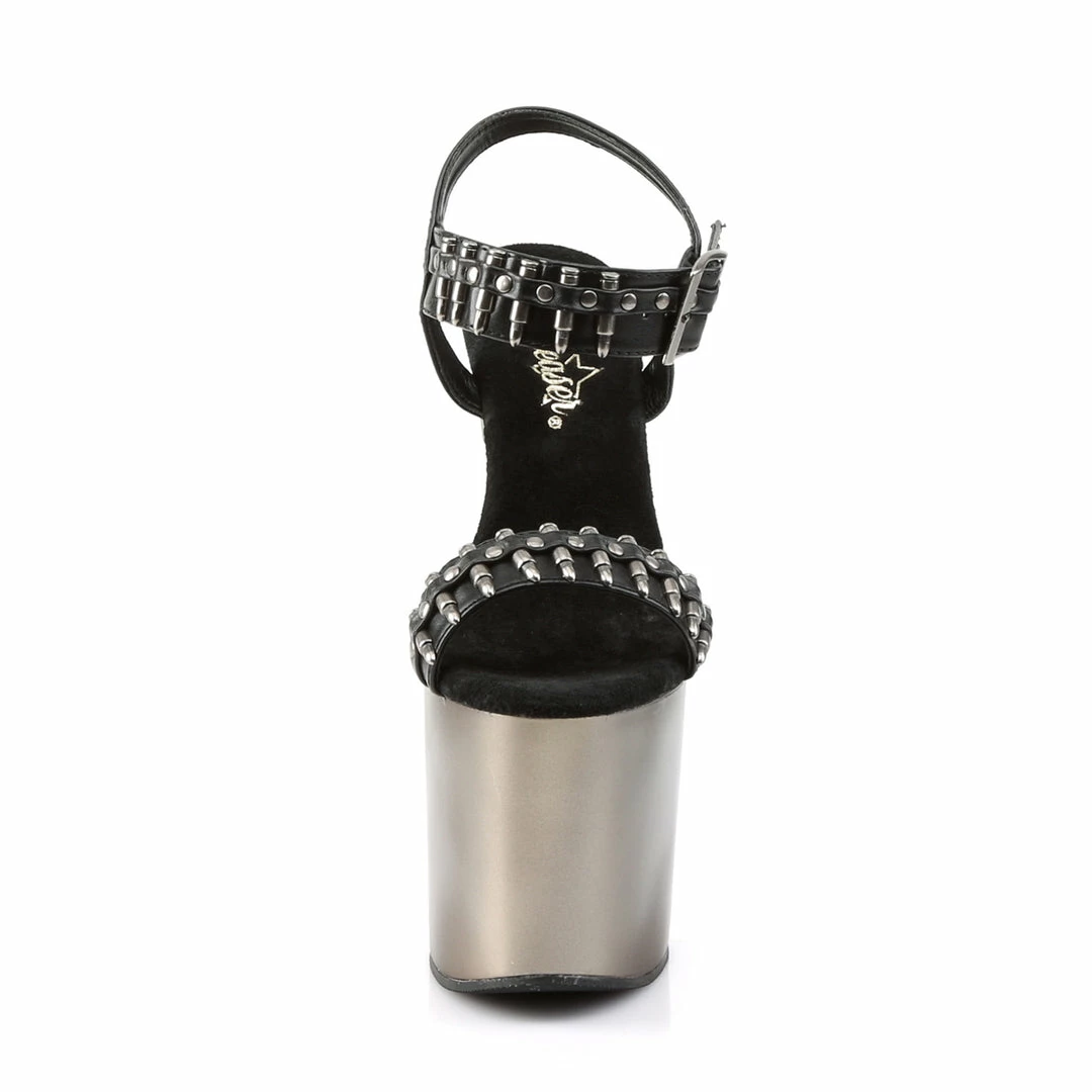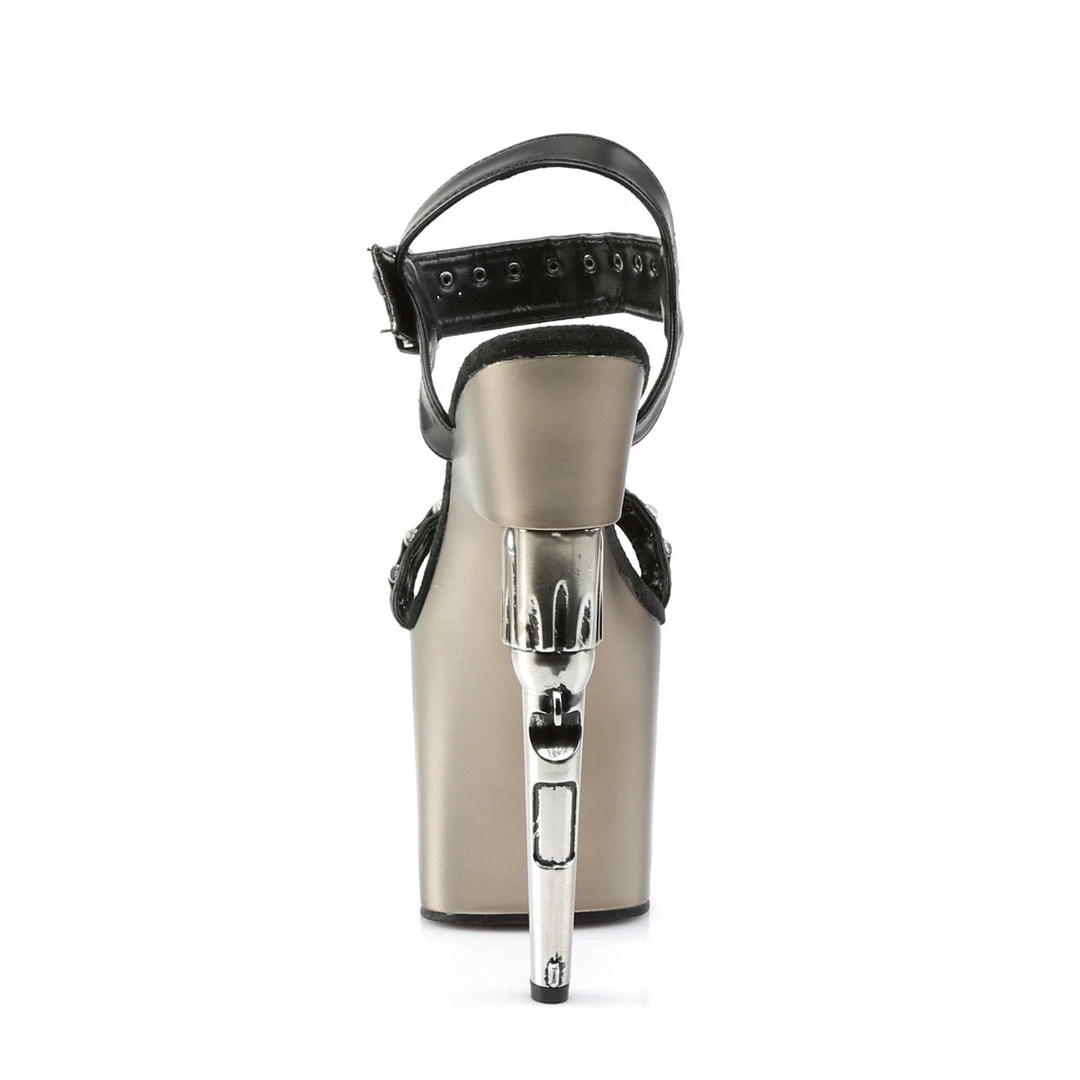 7 1/2″” (19cm) Gun Heel 3 1/2″” (8.9cm) Platform Ankle Strap Platform Sandal with Bullet Strap