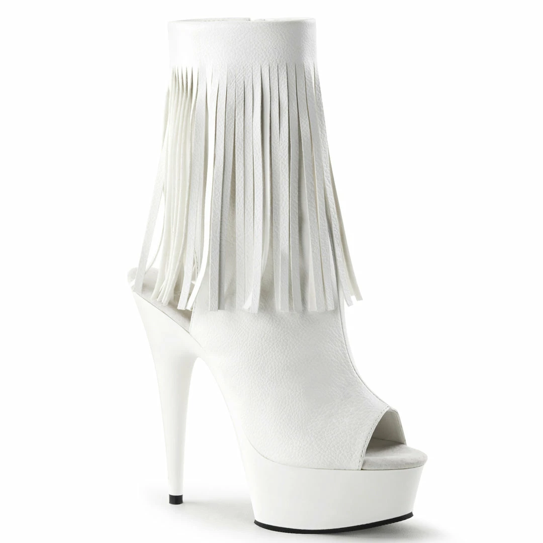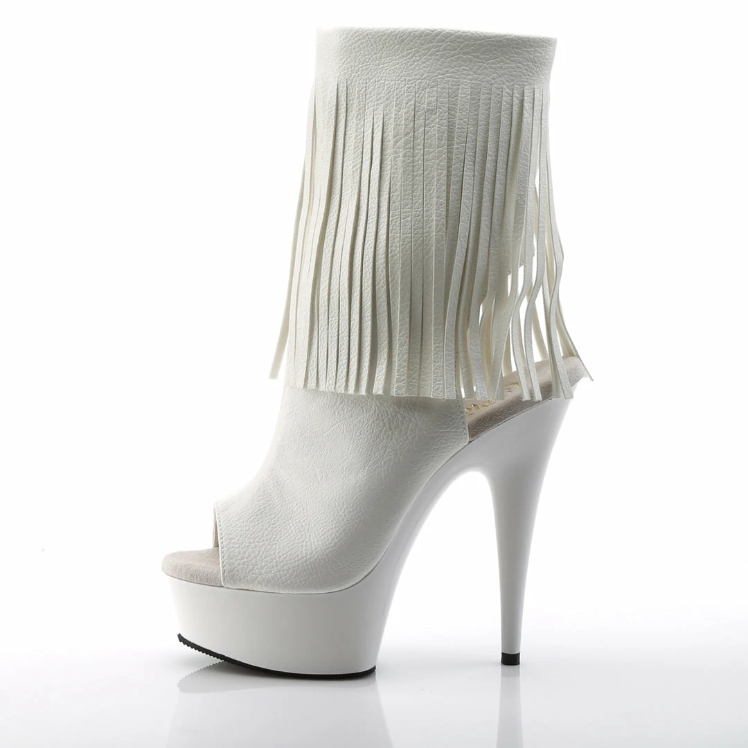 6″” (15.2cm) Stiletto Heel, 1 3/4″” (4.5cm) Platform Open Toe/Heel Fringe Ankle Boot, Inside Zip Closure