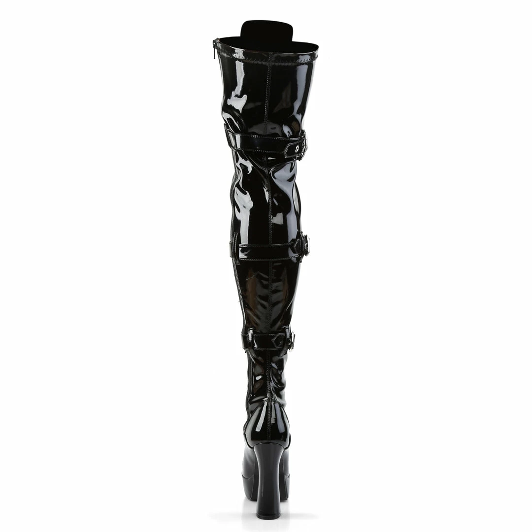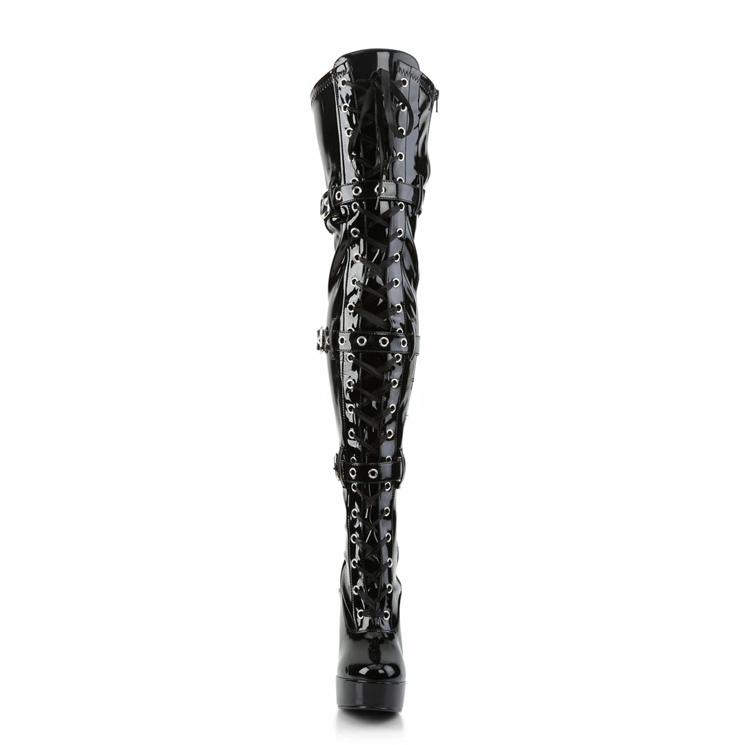 5″ (12.7cm) Stiletto Heel, 1 1/2″ (3.8cm) Platform Ribbon Lace-Up Triple Buckle Strap Stretch Thigh High Boot, Full Inside Zip Closure