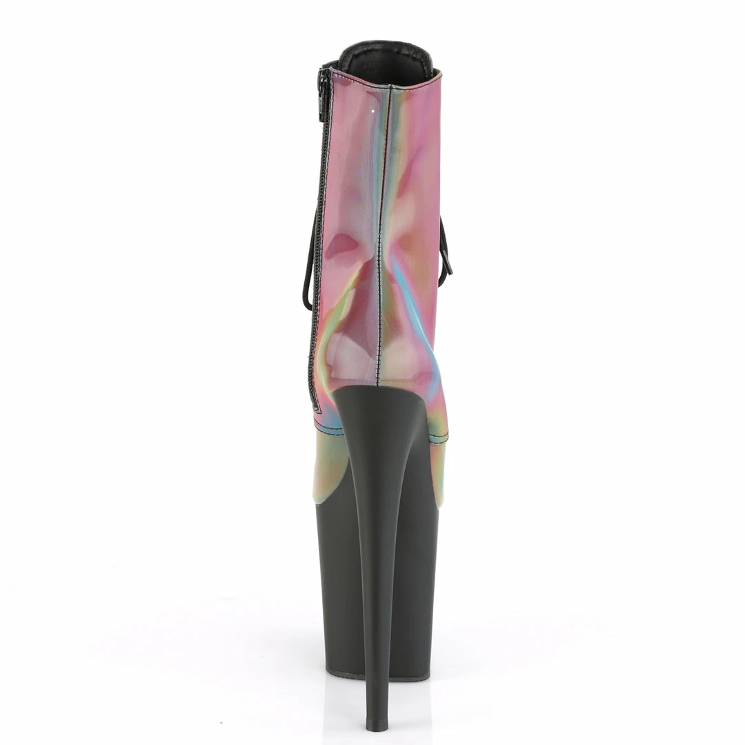 8″” (200mm) Heel, 4″” (100mm) Platform Lace-Up Front Ankle Boot w/ Rainbow Reflective Effect Upper, Inside Zip Closure