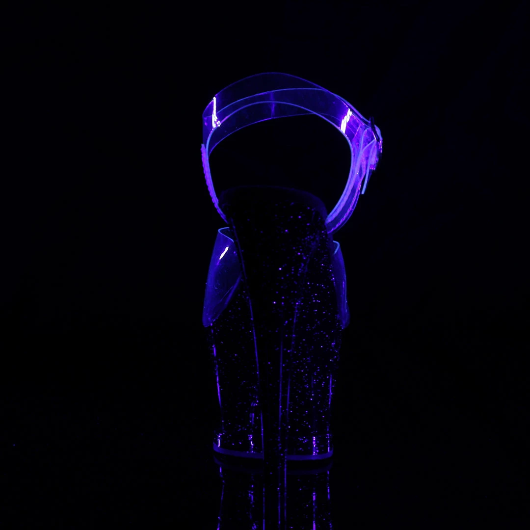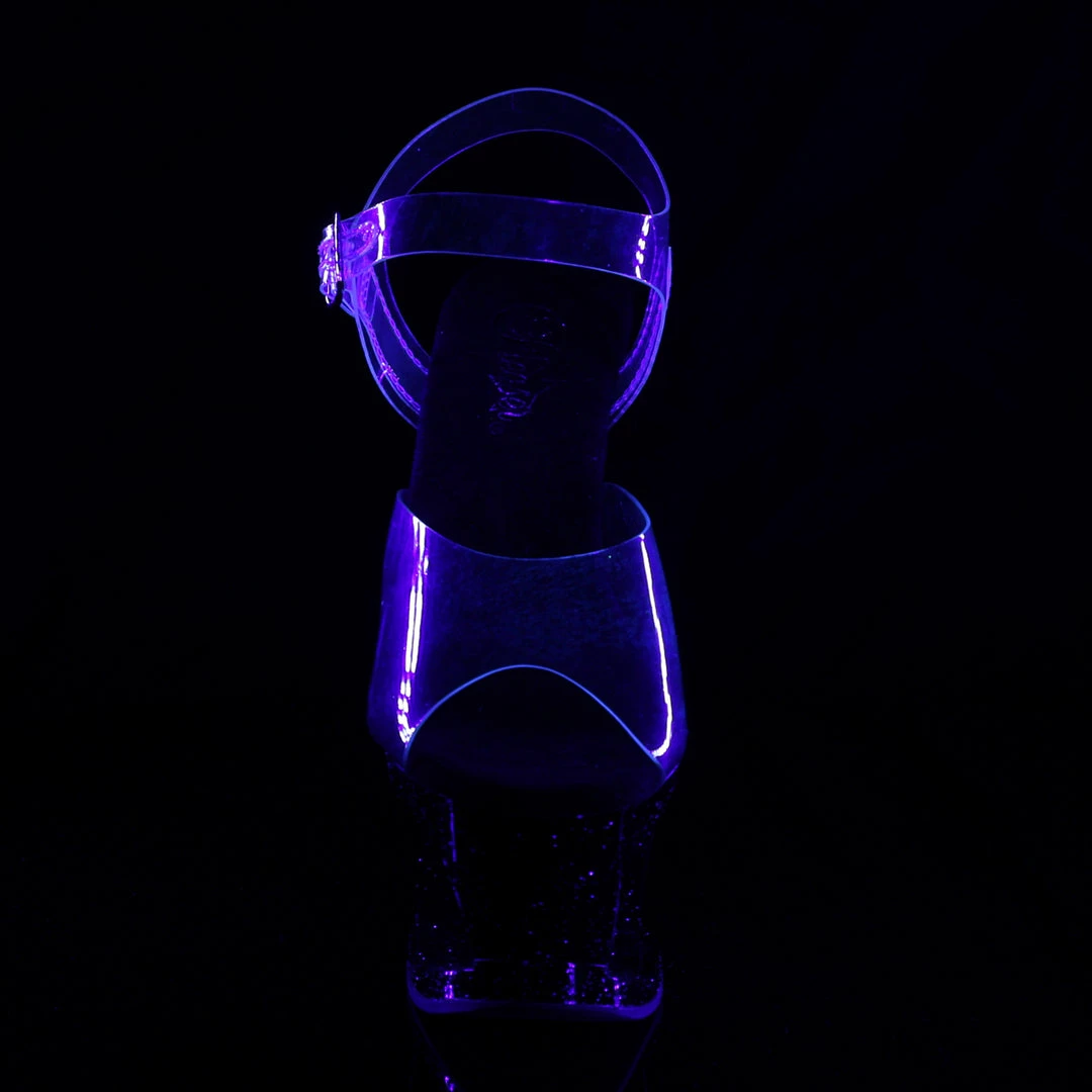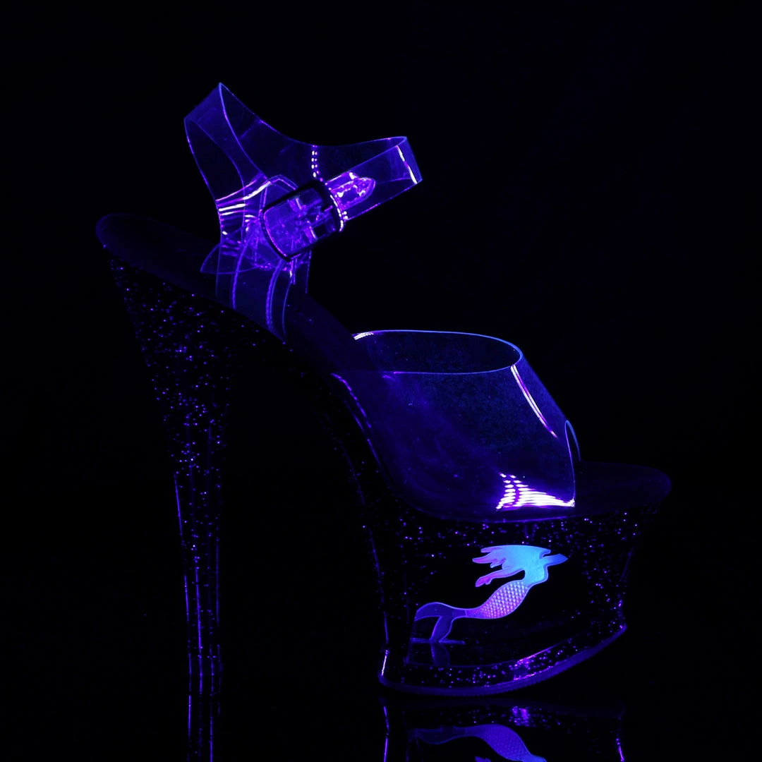 7″ (178mm) Heel, 2 3/4″ (70mm) Cut-Out Platform Ankle Strap Sandal Featuring Blacklight Reactive Ombre Mermaid in the Platform and Mini Iridescent Glitters on the Platform Bottom
