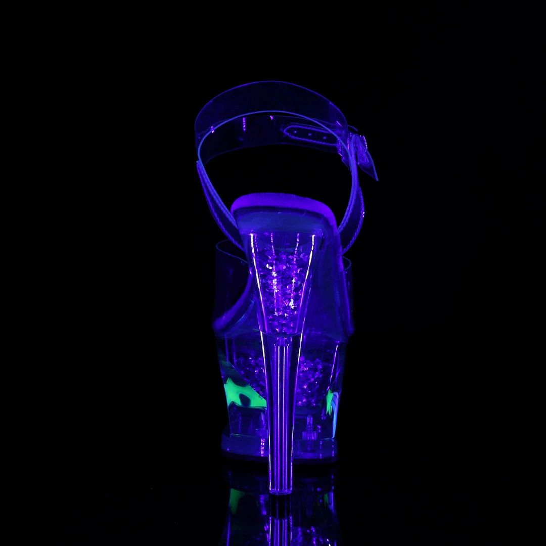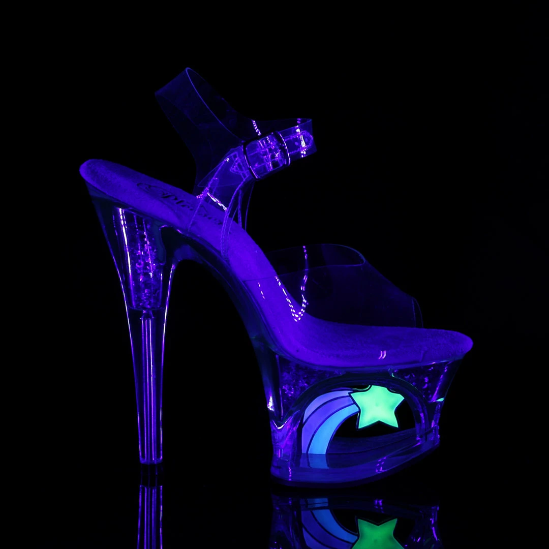 7″ (178mm) Heel, 2 3/4″ (70mm) Cut-Out Platform Ankle Strap Sandal Featuring Blacklight Reactive Shooting Star Inside the Platform Cutout and Star & Moon Shape Glitters Inserted in the Platform and Heel