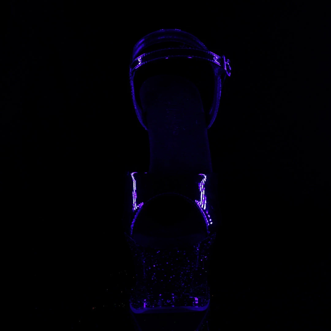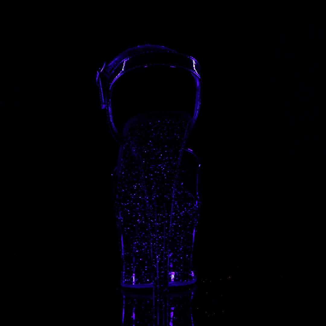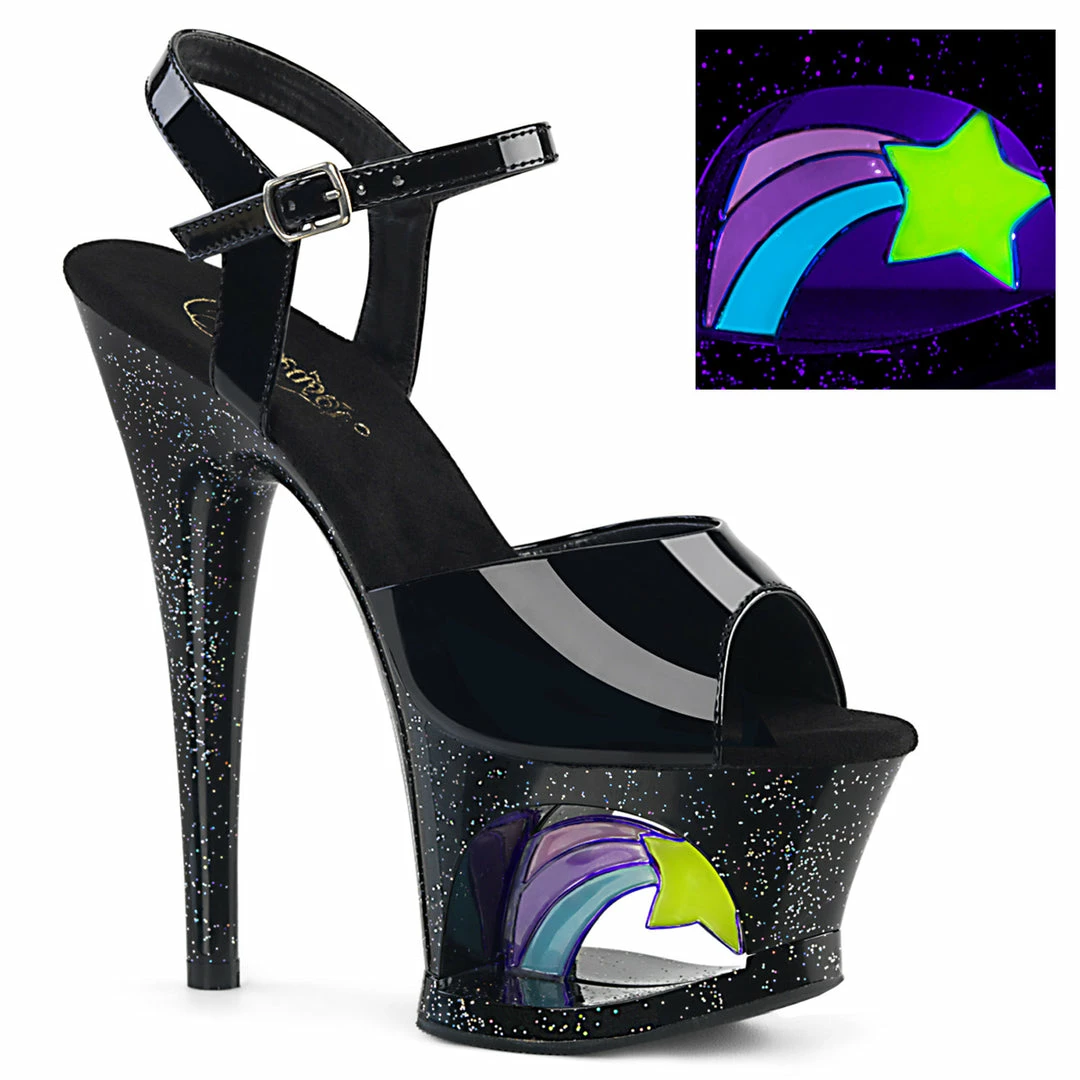 7″ (178mm) Heel, 2 3/4″ (70mm) Cut-Out Platform Ankle Strap Sandal Featuring Blacklight Reactive Shooting Star Inside the Cut-Out Platform and Mini Iridescent Glitters on the Entire Platfrom Bottom