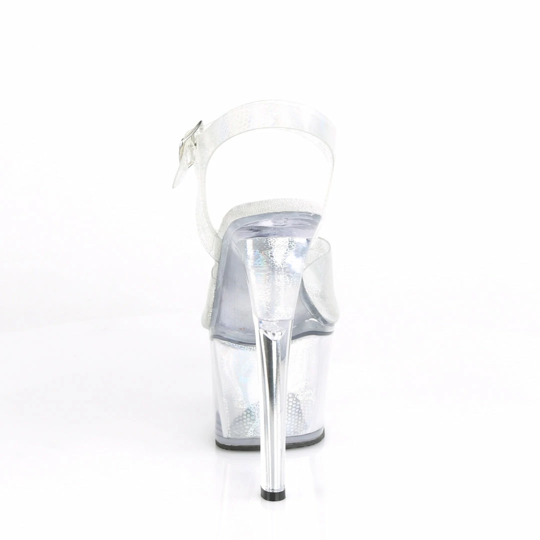 7″” (178mm) Heel, 2 3/4″” (70mm) Platform Ankle Strap Sandal Featuring Holographic TPU Upper and Inserts in the Platform Bottom
