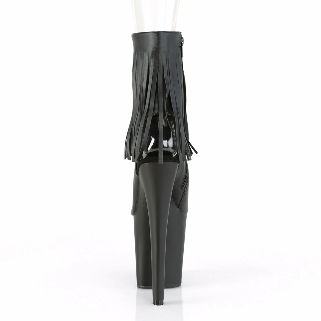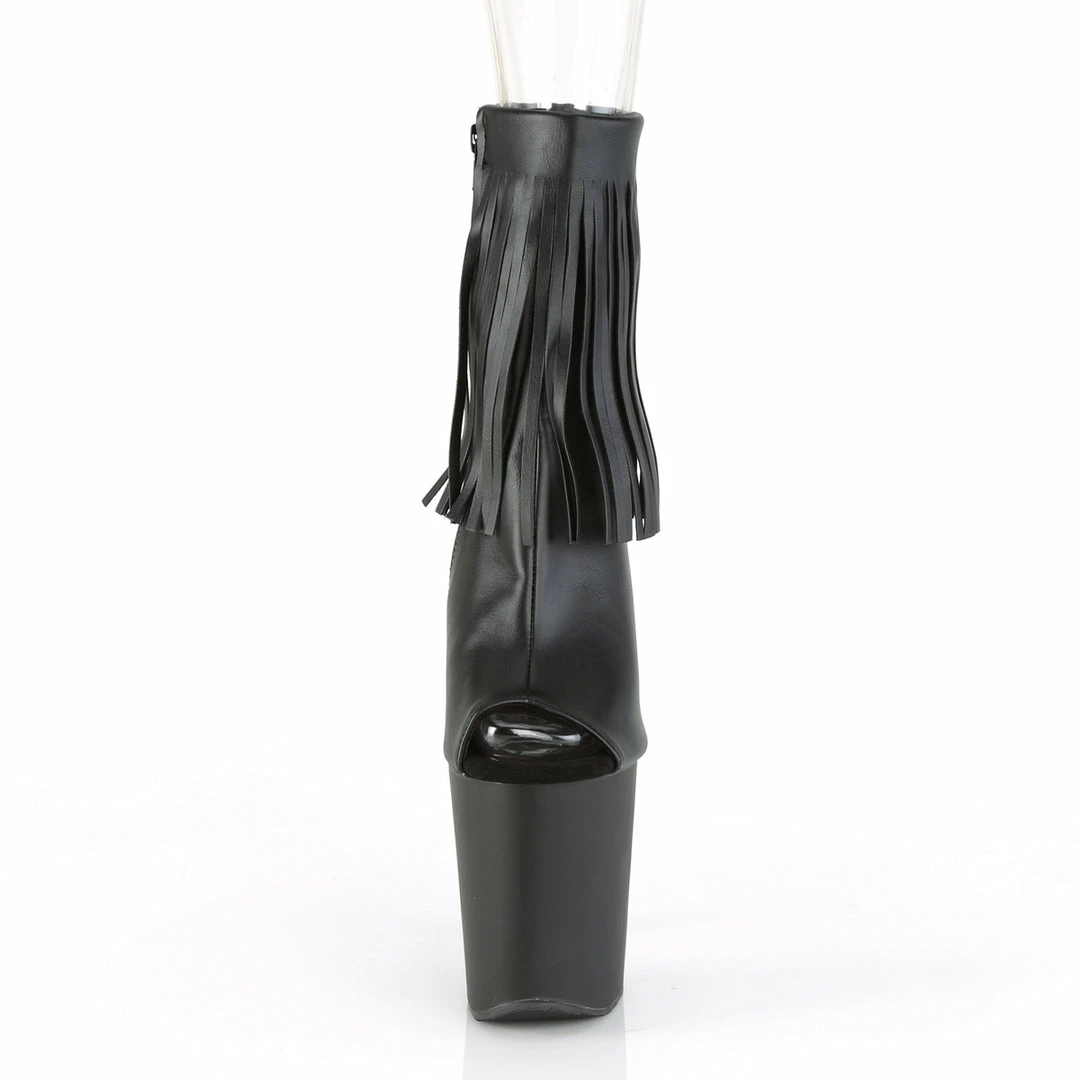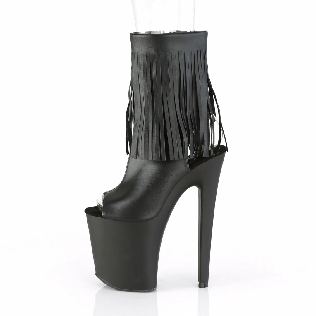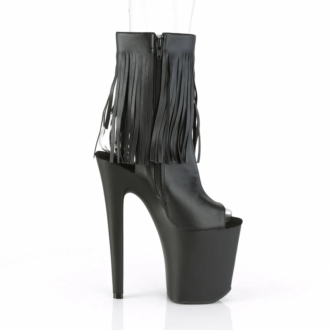 8″” (200mm) Heel, 4″” (100mm) Platform Open Toe/Heel Fringed Ankle Boot, Full Inside Zip Closure
