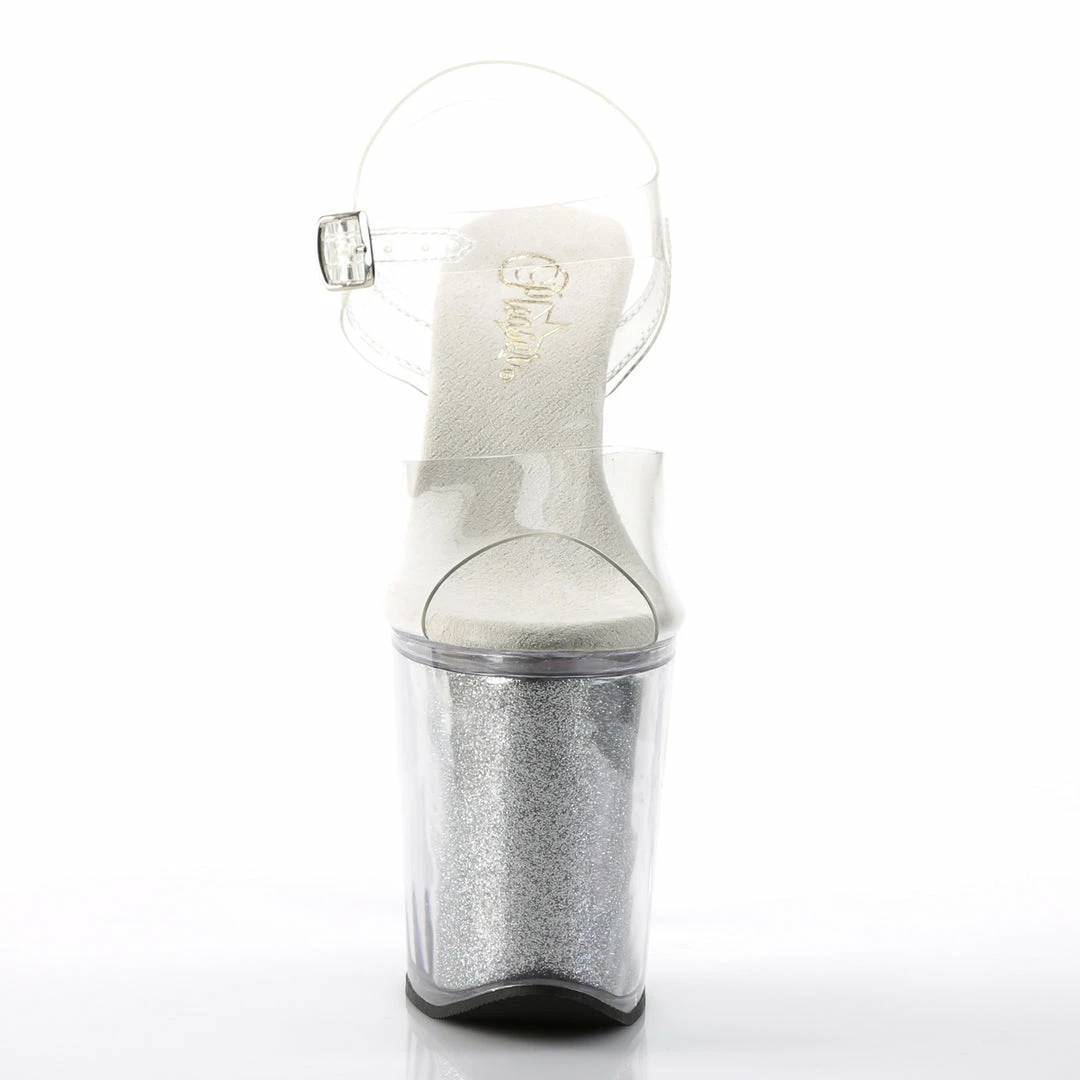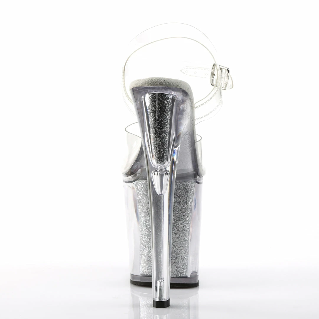 8″” (20.3cm) Heel, 4″” (10.2cm) Platform Ankle Strap Peep Toe Glitter Filled Platform Sandal, Clear/Silver Glitter