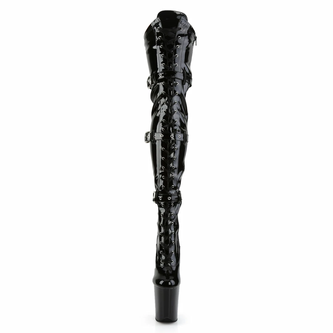 8″ (20.3cm) Stiletto Heel, 4″ (10.2cm) Platform Ribbon Lace-Up Triple Buckle Strap Stretch Thigh High Boot, Full Inside Zip Closure
