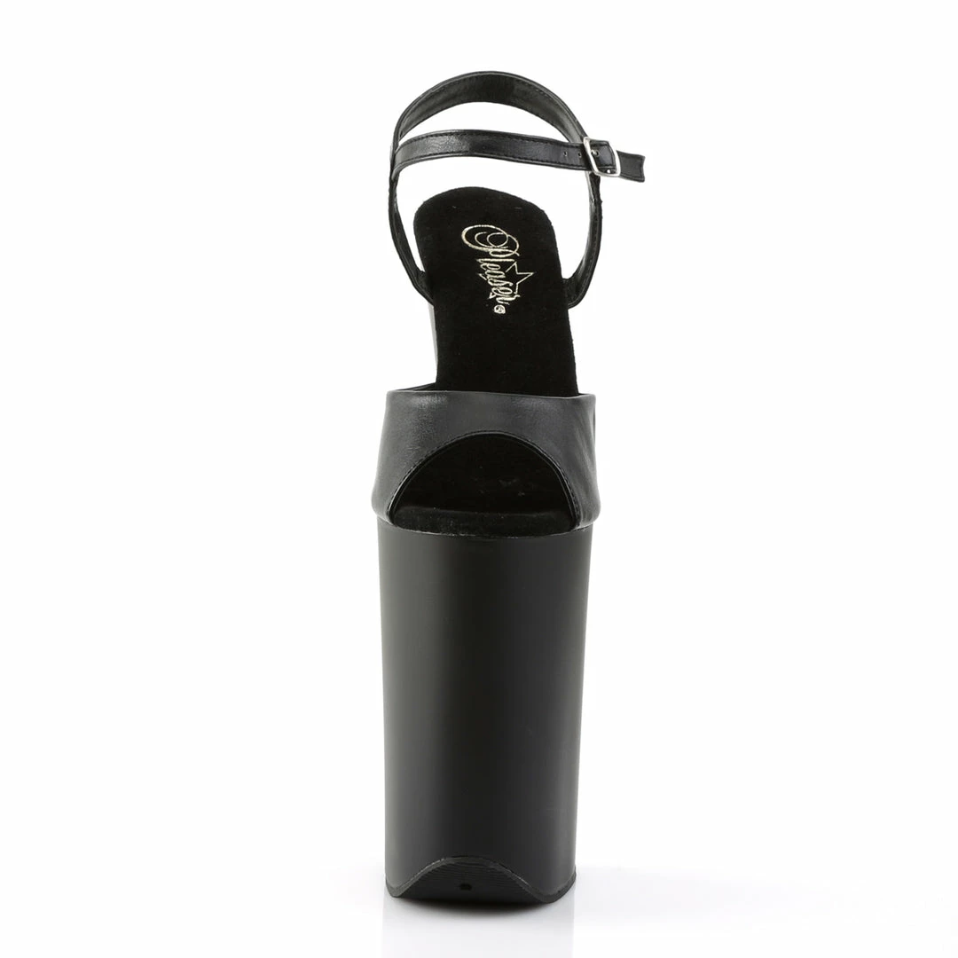 9″ (22.9cm) Heel, 5 1/4″ (13.3cm) Platform Ankle Strap Sandal. Black Faux Leather. Warning: Extreme High Heels. Not Recommended for Walking or Dancing.