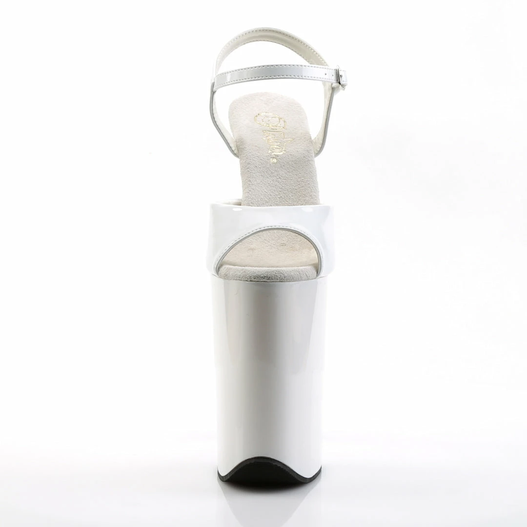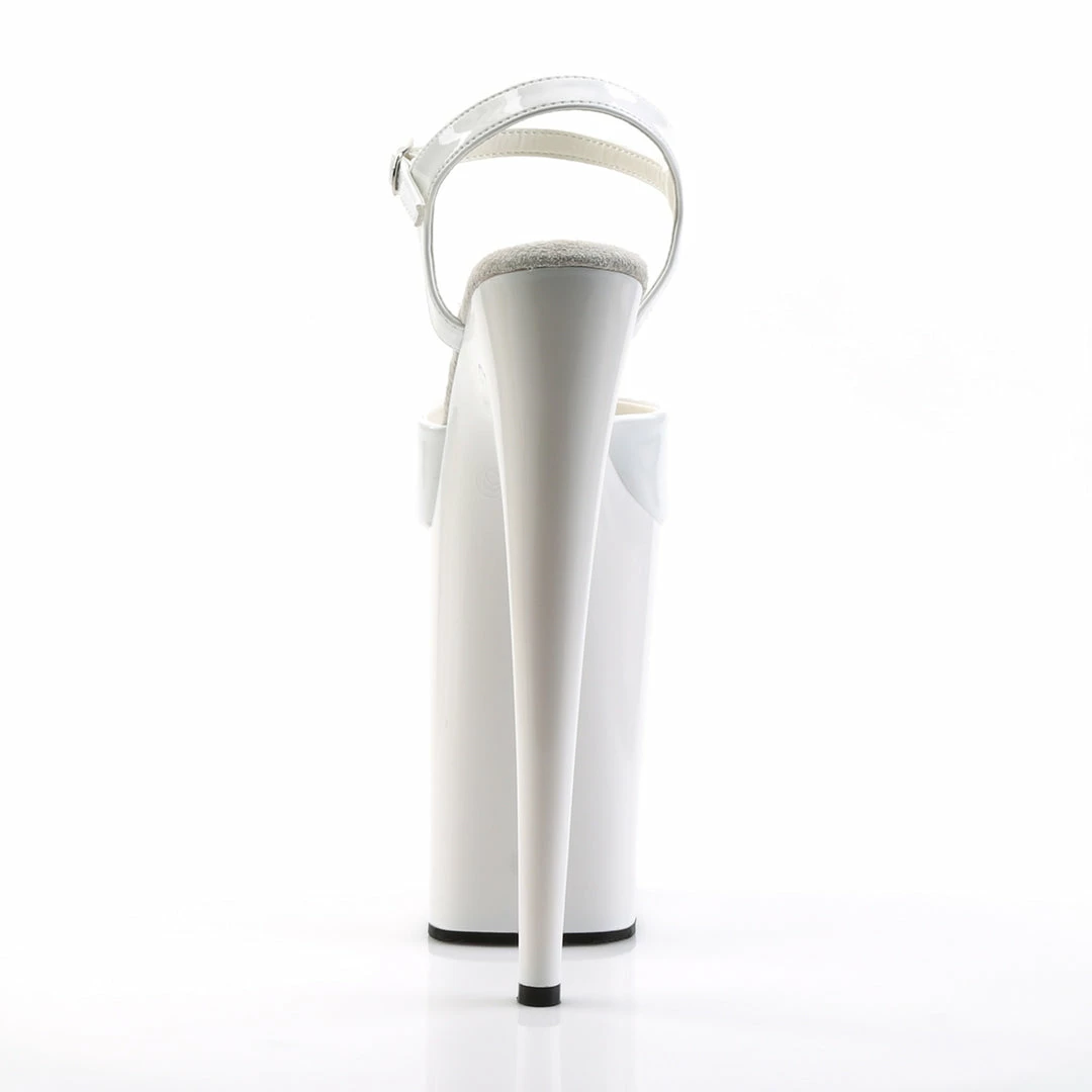 9″ (22.9cm) Heel, 5 1/4″ (13.3cm) Platform Ankle Strap Sandal Warning: Extreme High Heels. Not Recommended for Walking or Dancing. White Patent