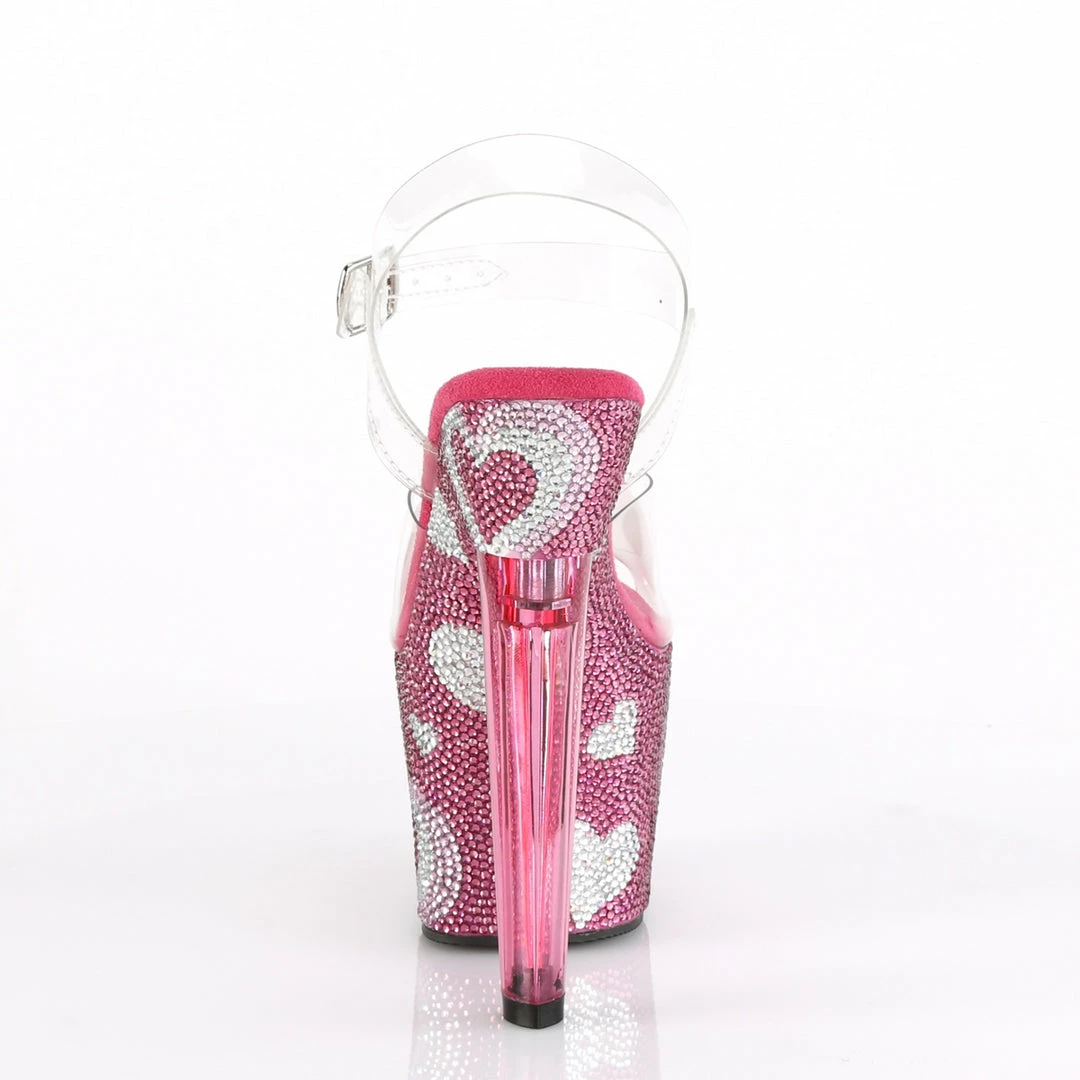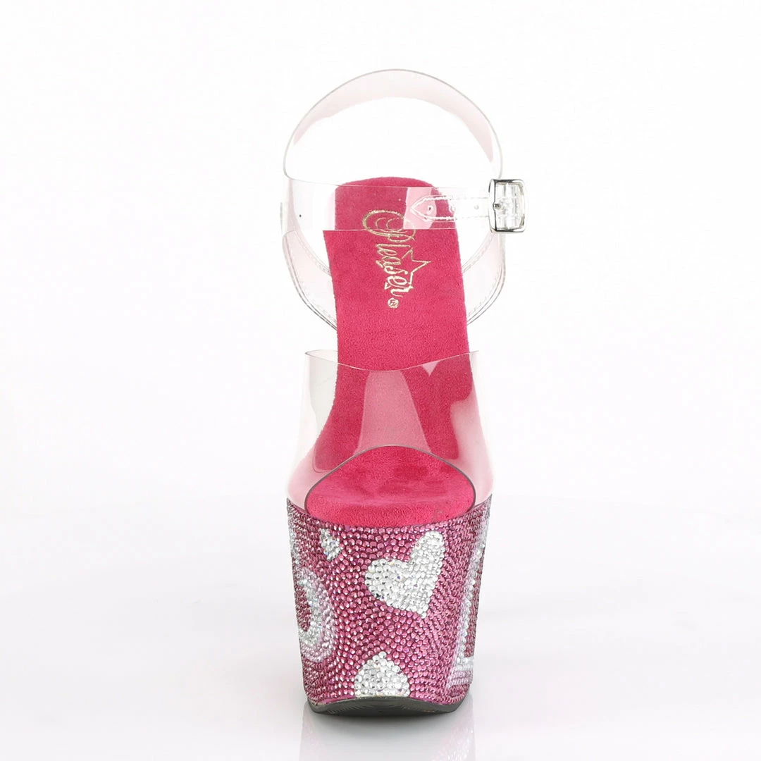 7″ (178mm) Heart Shaped Heel, 3 1/4″ (83mm) Platform Ankle Strap Sandal w/ Tinted Heel & Rhinestone Embellished Platform Bottom Featuring Contrast Colour Hearts