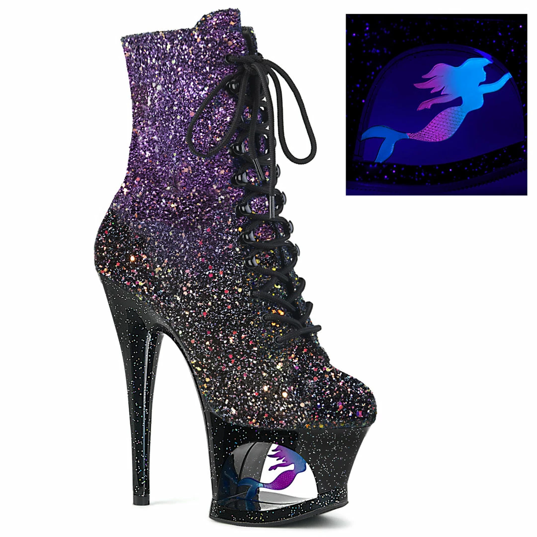 7″ (178mm) Heel, 2 3/4″ (70mm) Cut-Out Platform Lace-Up Front Ankle Boot Featuring Blacklight Reactive Swimming Mermaid Inside the Platform Cutout and Mini Iridescent Glitters on the Entire Platform Bottom, Full Inside Zip Closure