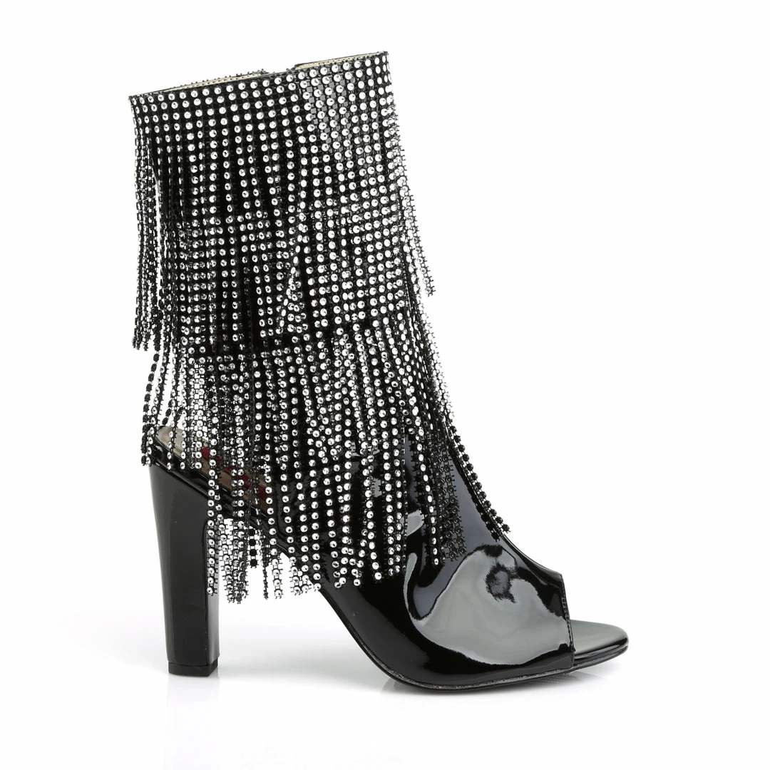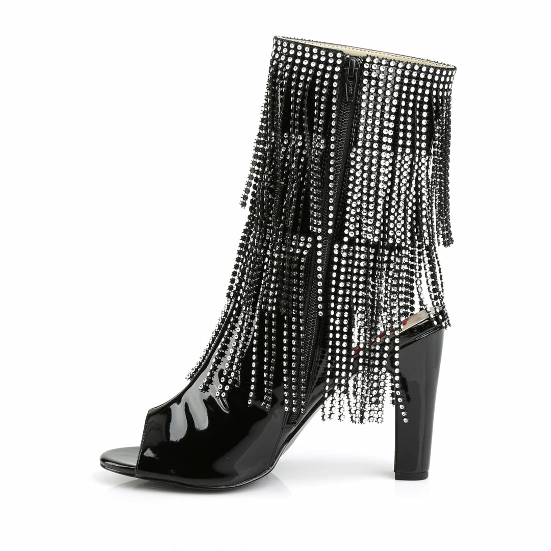 4″ (10.2cm) Heel, 1 1/2″ (3.8cm) Platform Open Toe/Heel Back Lace-Up Ankle Boot Featuring 4-Layer Chrome Plated, Simulated Rhinestone Fringe, Inside Zip Closure