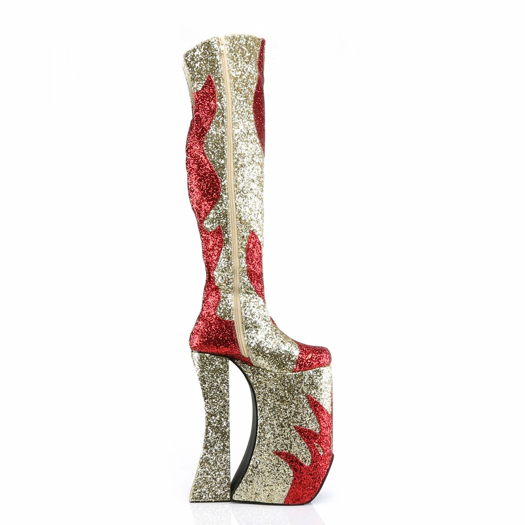 11″” (27.9cm) Heel, 9 3/4″” (24.8cm) Platform Thigh Boot with Flame Detail, Full Inner Side Zipper